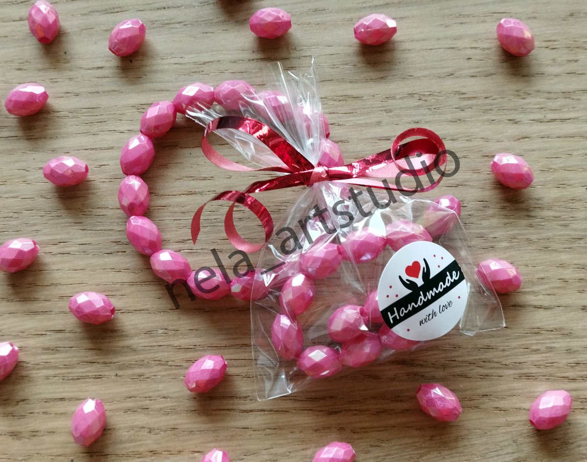 Náramek z korálků ve tvaru oválu.Akrylové, fasetované korálky s leskem ve tvaru oválu 12x8mm + elastická lycra 0,8mm (pružný návlekový materiál), průvlak cca 1,8mm.Rozměry náramku: cca 17,5cm (15 korálků). Zabaleno v celofánovém sáčku.