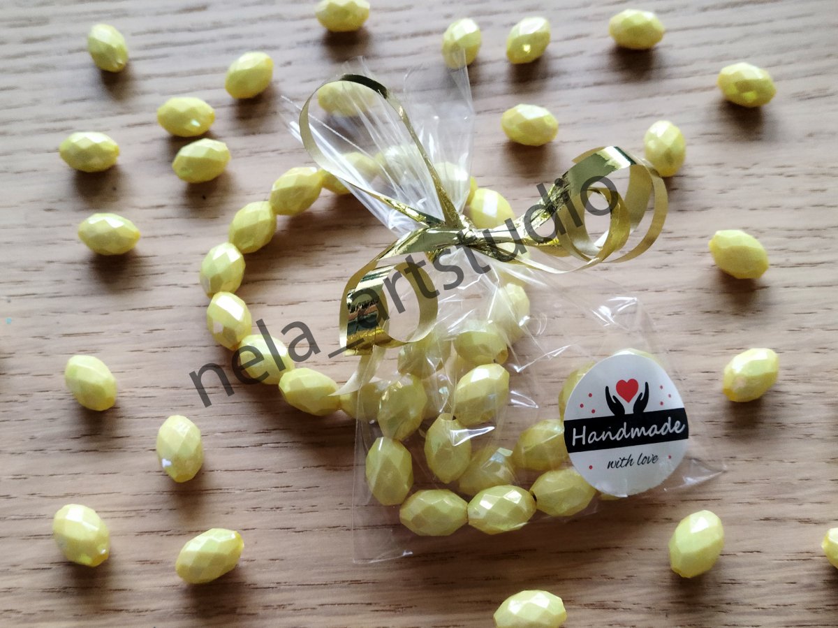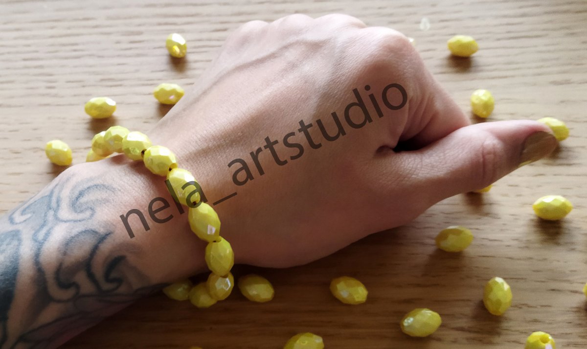 Náramek z korálků ve tvaru oválu.Akrylové, fasetované korálky s leskem ve tvaru oválu 12x8mm + elastická lycra 0,8mm (pružný návlekový materiál), průvlak cca 1,8mm.Rozměry náramku: cca 17,5cm (15 korálků). Zabaleno v celofánovém sáčku.