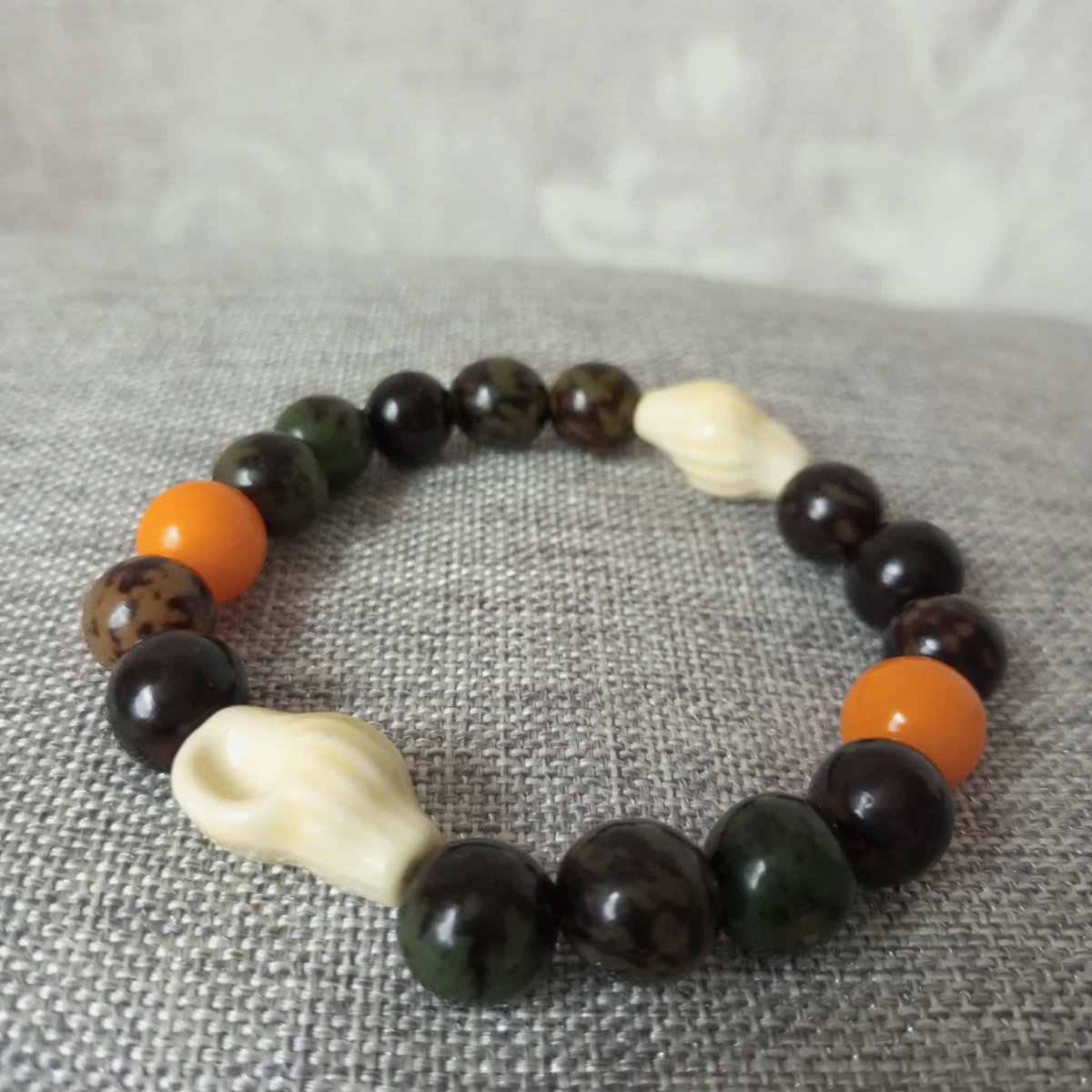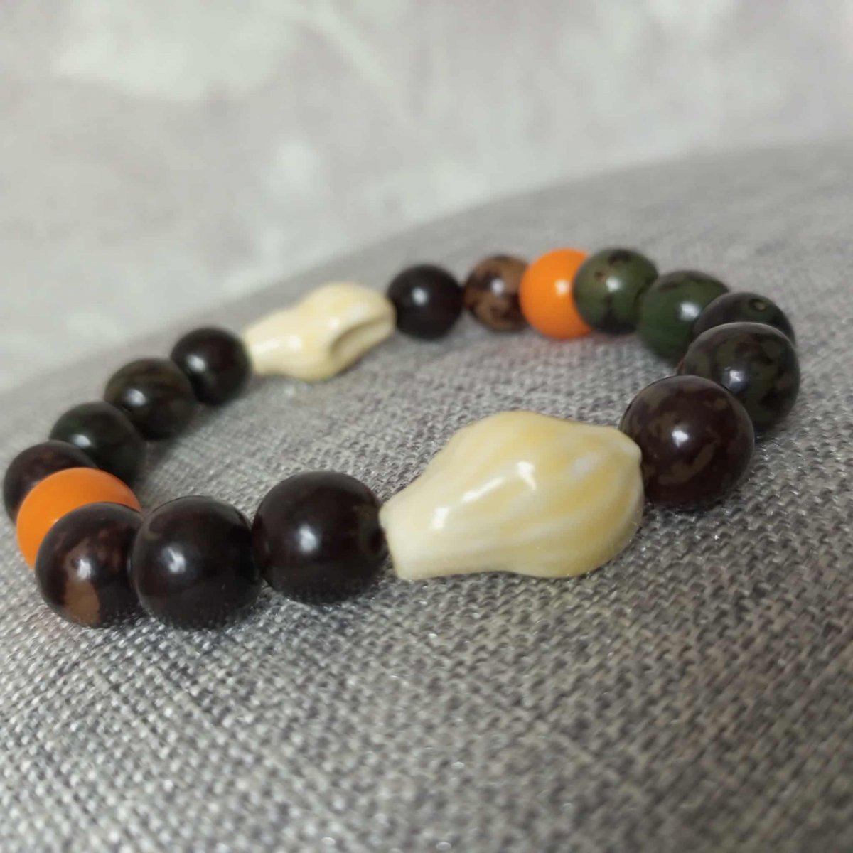 Náremek z korálků z kořene Bodhi . Korálky jsou velké 10mm s keramickými ulitami