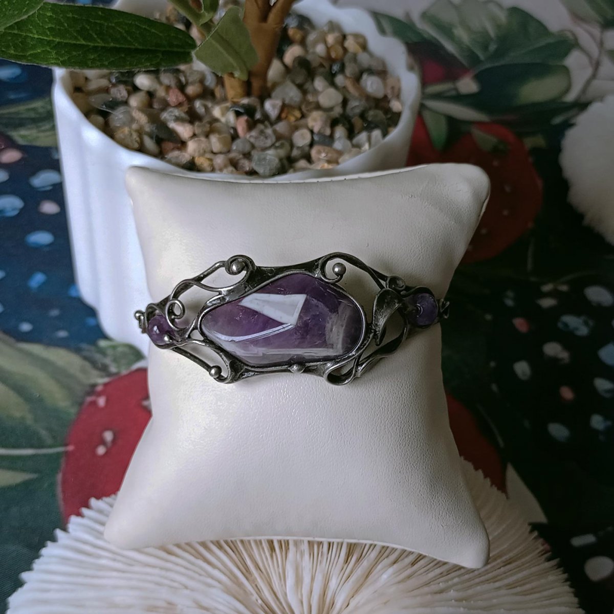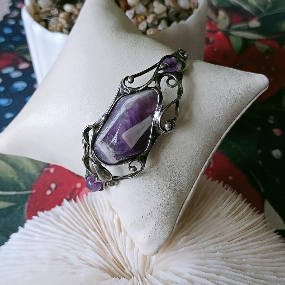 Autorský šperk zhotoven z bezolovnatého cínu se stříbrem, ametystů a drátu.