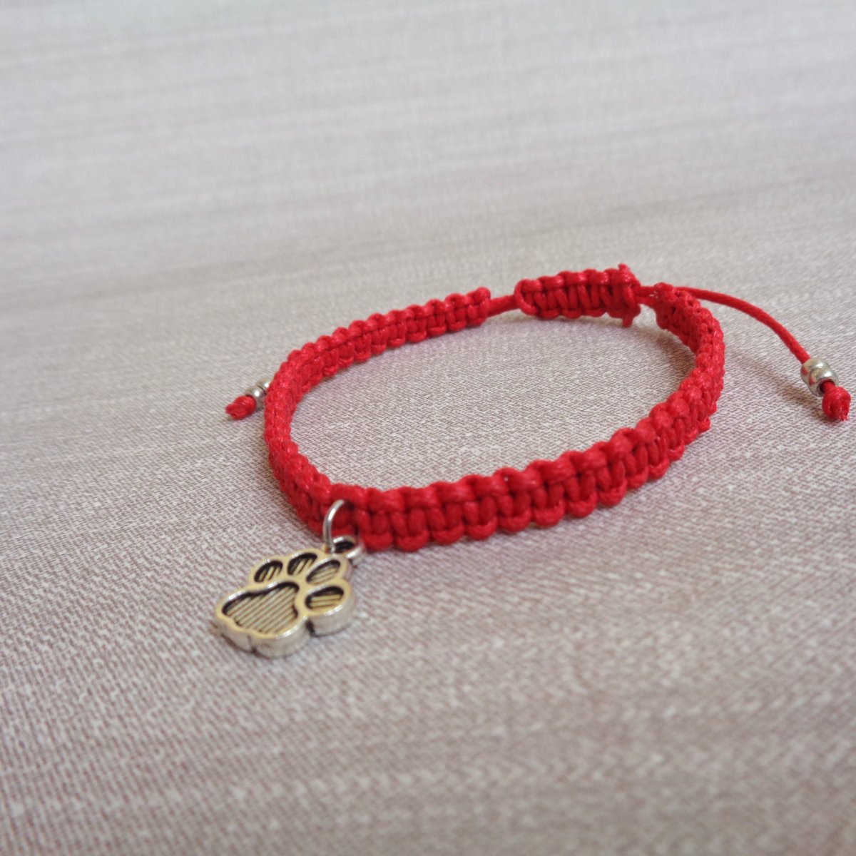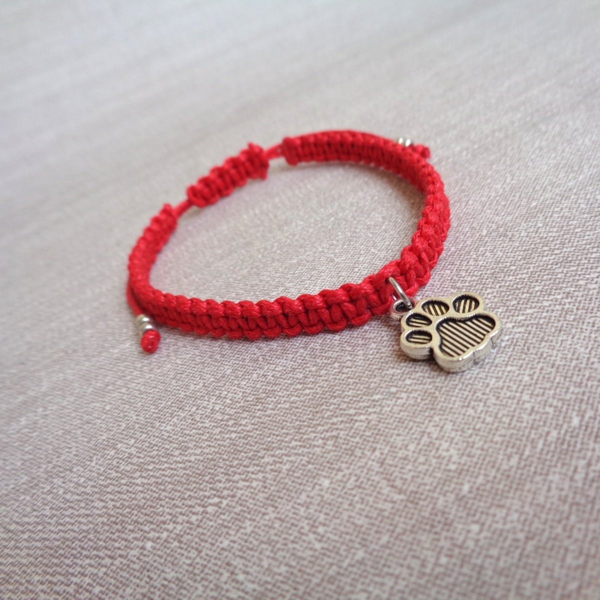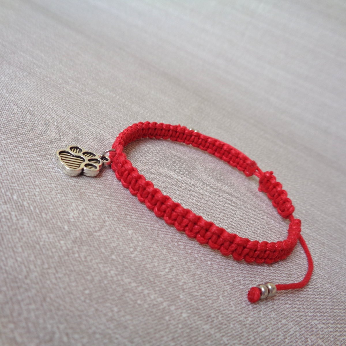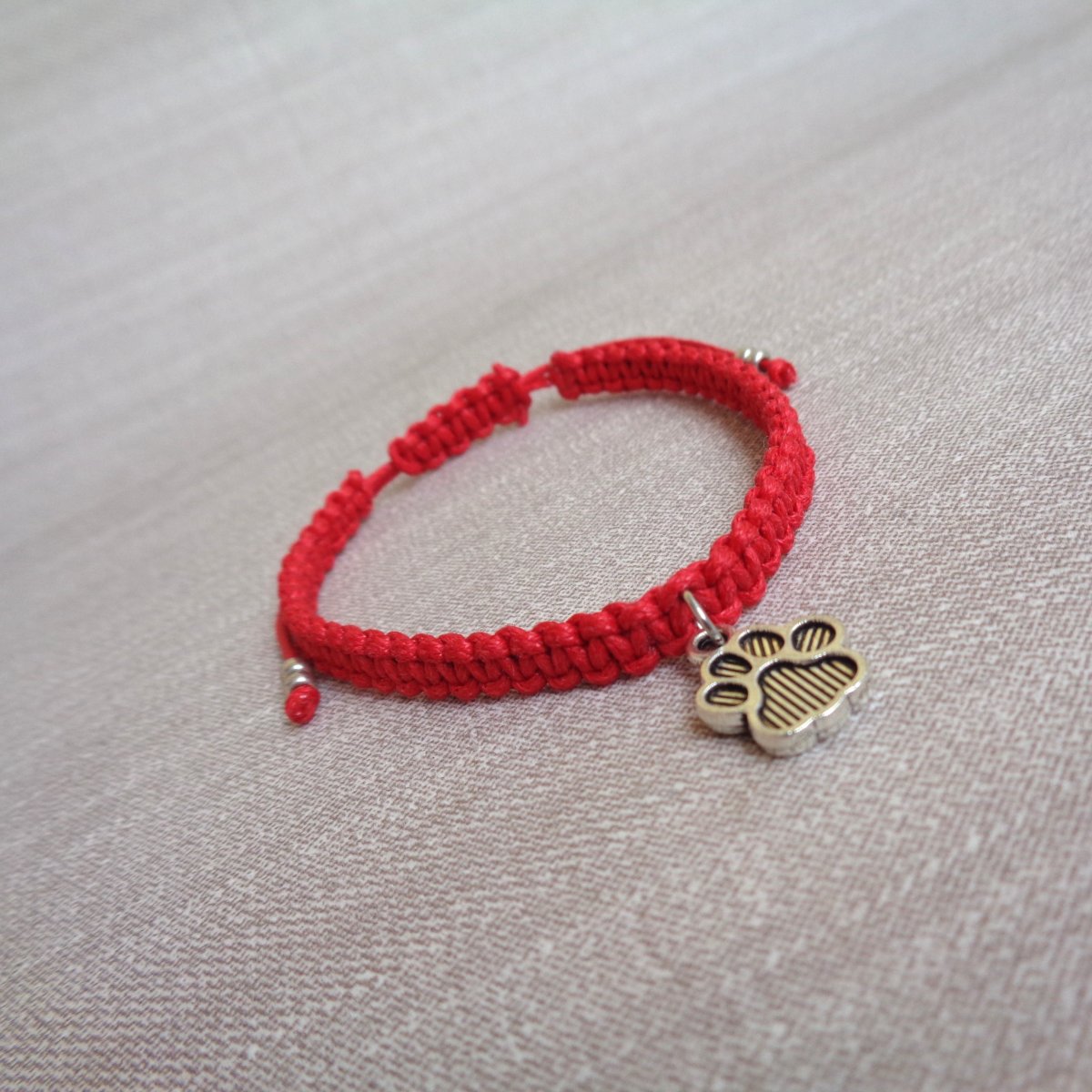 ... shamballa náramek z červené voskované šňůrky a přívěsku - tlapičky ve stříbrné barvě. Doplněný je drobným rokajlem