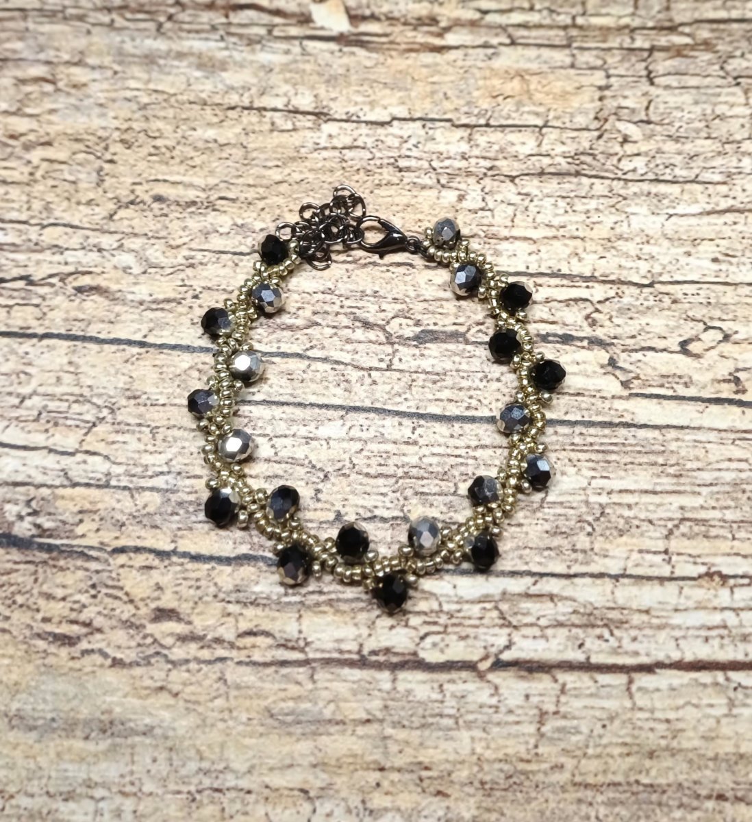 Náhrdelník je šitý ze stříbrných korálků Preciosa, doplněny stříbrnočernými skleněnými, broušenými korálkami 0,5 cm