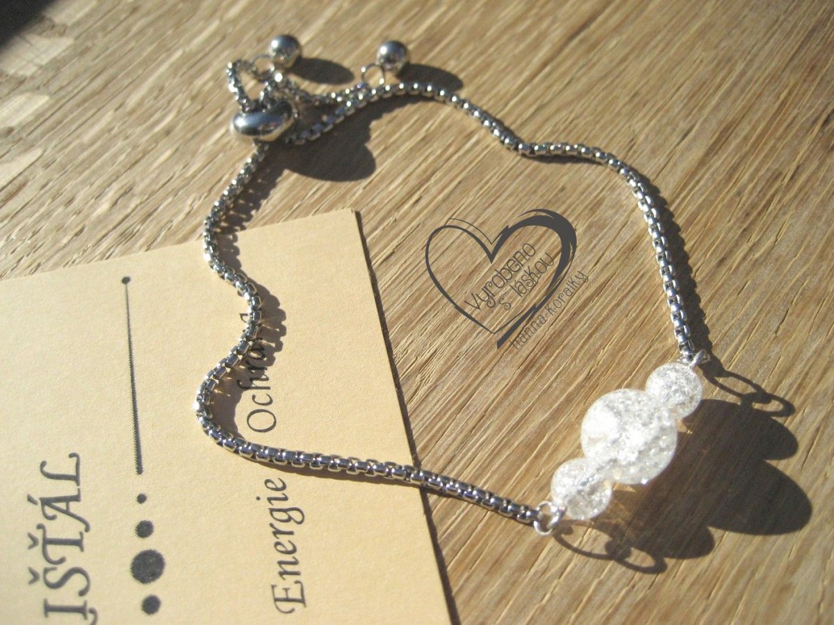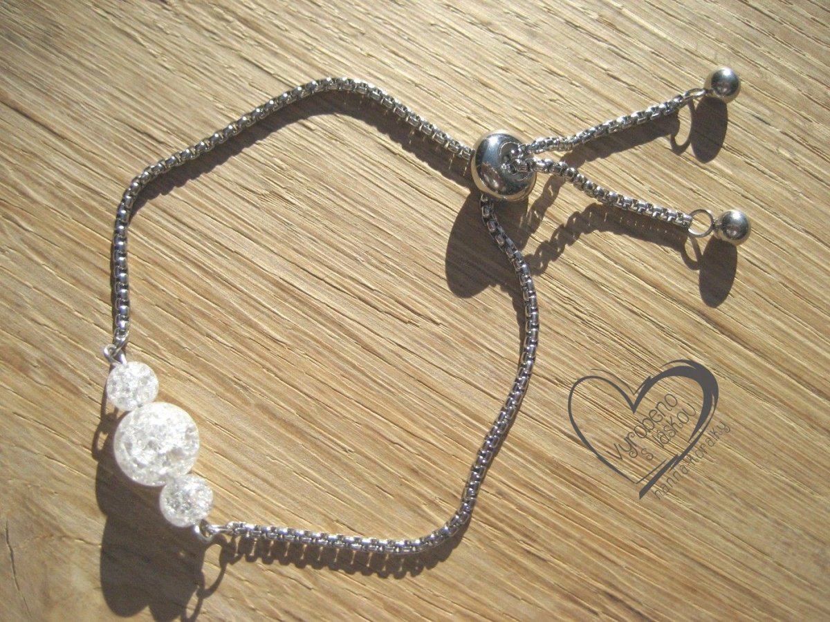 Moderní a zároveň elegantní náramek z nerez oceli 304 s posuvným zapínáním a doplněný kuličkami minerálu Křišťál, stahovací zapínání umožňuje nastavitelnou délku až do 23,5 cm, takže se přizpůsobí zápěstí a vámi preferovaného stylu, foto je ilustrační, protože každý náramek doplněný minerálem je originál, tudíž se může nepatrně lišit odstínem barvy minerálních kuliček.