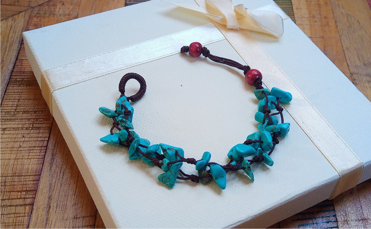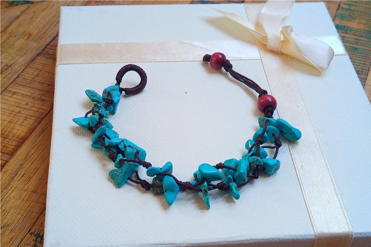 Náramek vyrobený ze zlomků tyrkysu na hnědé šňůrce stylem macramé se zapínáním přes dřevěný korálek v tmavě červené barvě