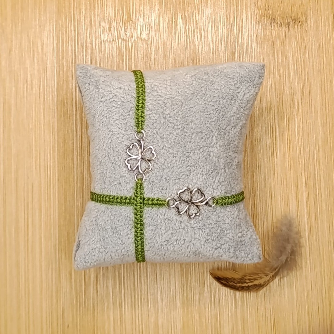 Náramky tkané technikou macramé z C-lonu odstín moss ( zelená mechová), kovový čtyřlístek.