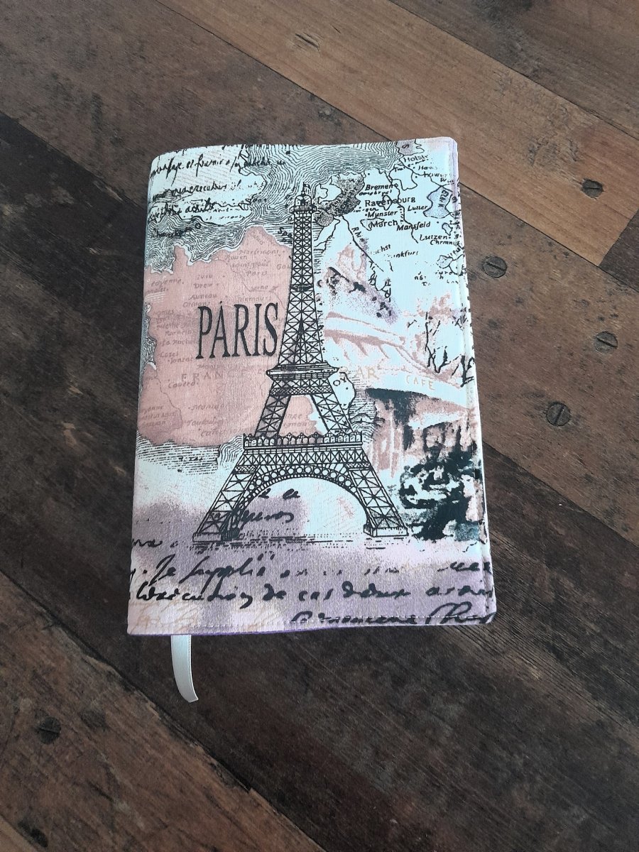 Nabízím nastavitelný obal na knihu, diář,zápisník. Šitý z látky s potiskem Paříže. Vnitřek je fialový. Vystužený ronofixem.
