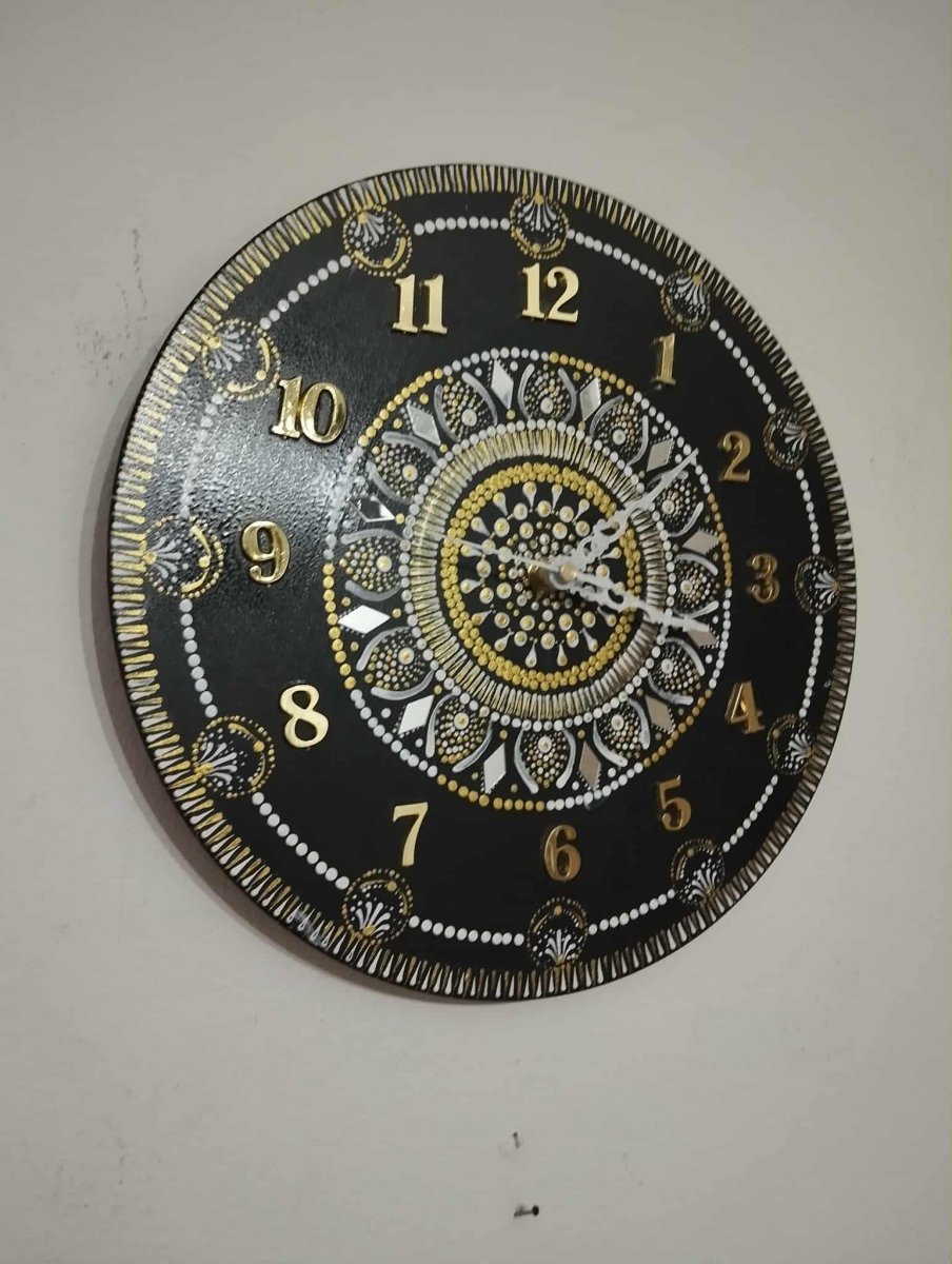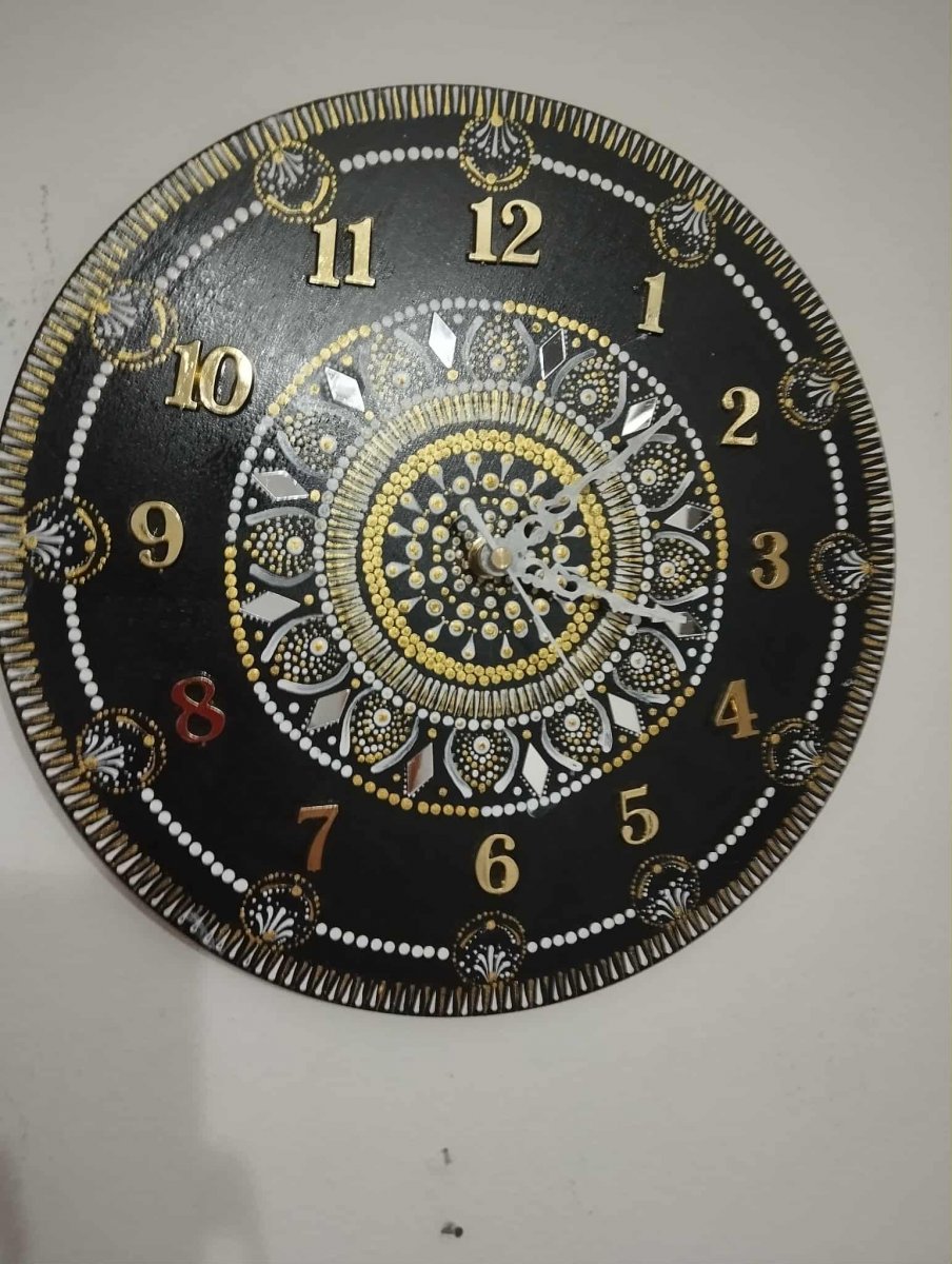 Nástěnné hodiny bílo/zlaté jsou dokonalou kombinací elegance a funkčnosti. Skvělý doplněk, který obohatí každý interiér, ať už v domácnosti nebo v kanceláři. Malováno akrylovými barvami , použity skleněné sklíčka .