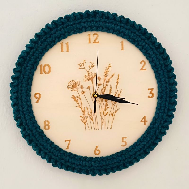 Nástěnné hodiny s lučním kvítím jsou vyrobeny z topolové překližky a 100% bavlněné šňůry, což jim dodává přírodní a jemný vzhled.