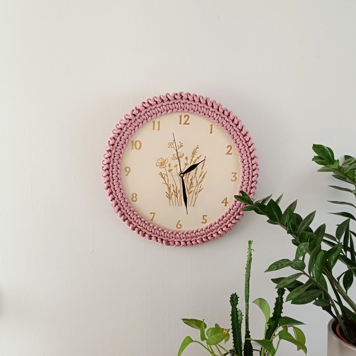 Nástěnné hodiny s lučním kvítím jsou vyrobeny z topolové překližky a 100% bavlněné šňůry, což jim dodává přírodní a jemný vzhled.