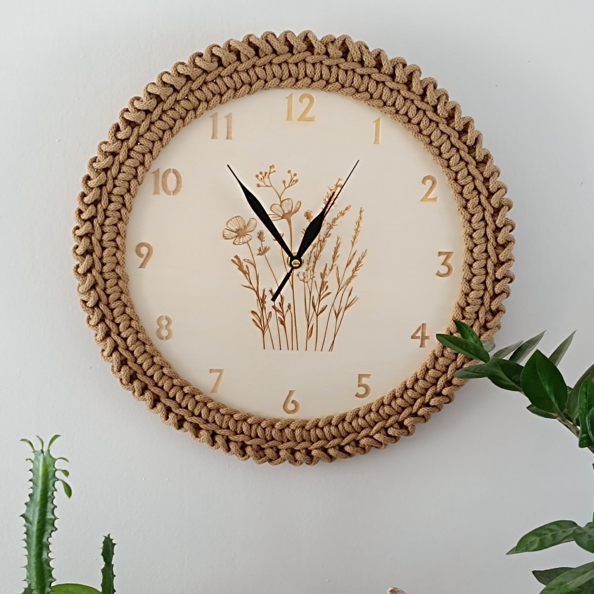 Nástěnné hodiny s lučním kvítím jsou vyrobeny z topolové překližky a 100% bavlněné šňůry, což jim dodává přírodní a jemný vzhled.
