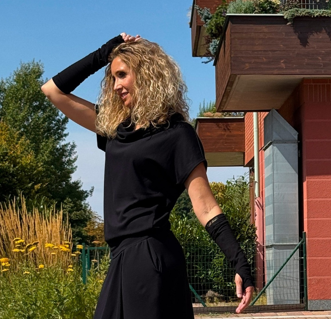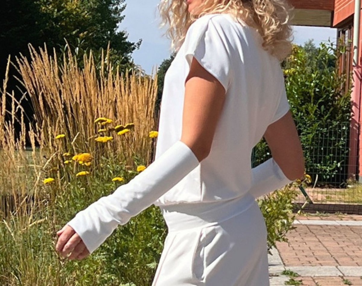 Nátepníky jsou ušité ze středně silného úpletu viskóza/pes/elastan.