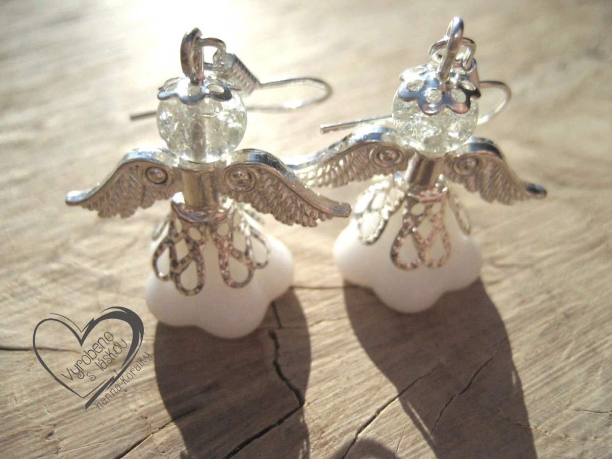 Andělské náušnice - andílci - andělíčci v kombinaci korálku v barvě - bílé, čiré a stříbrných bižuterních komponentů, délka 2,5 cm + náušnicový háček