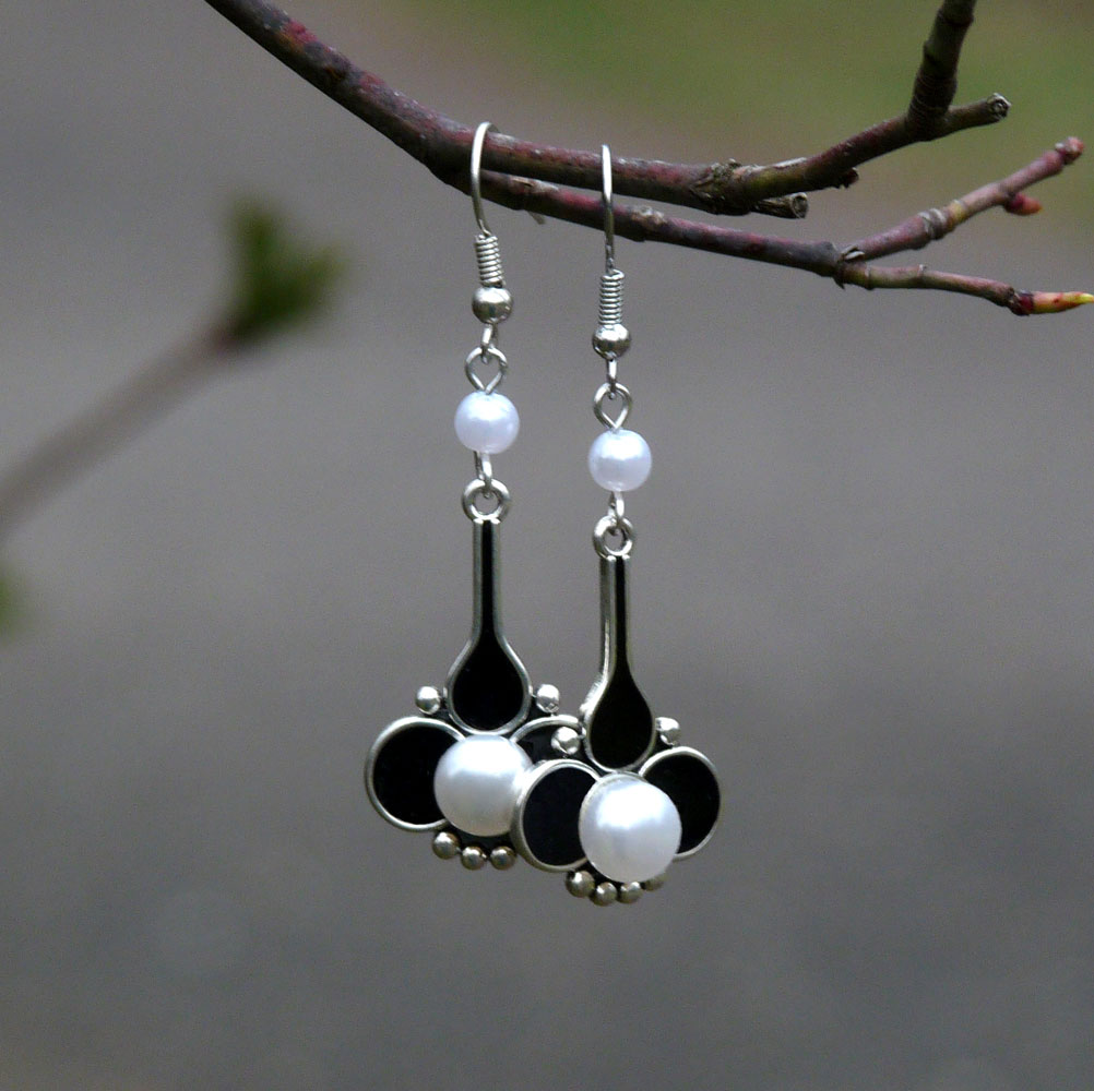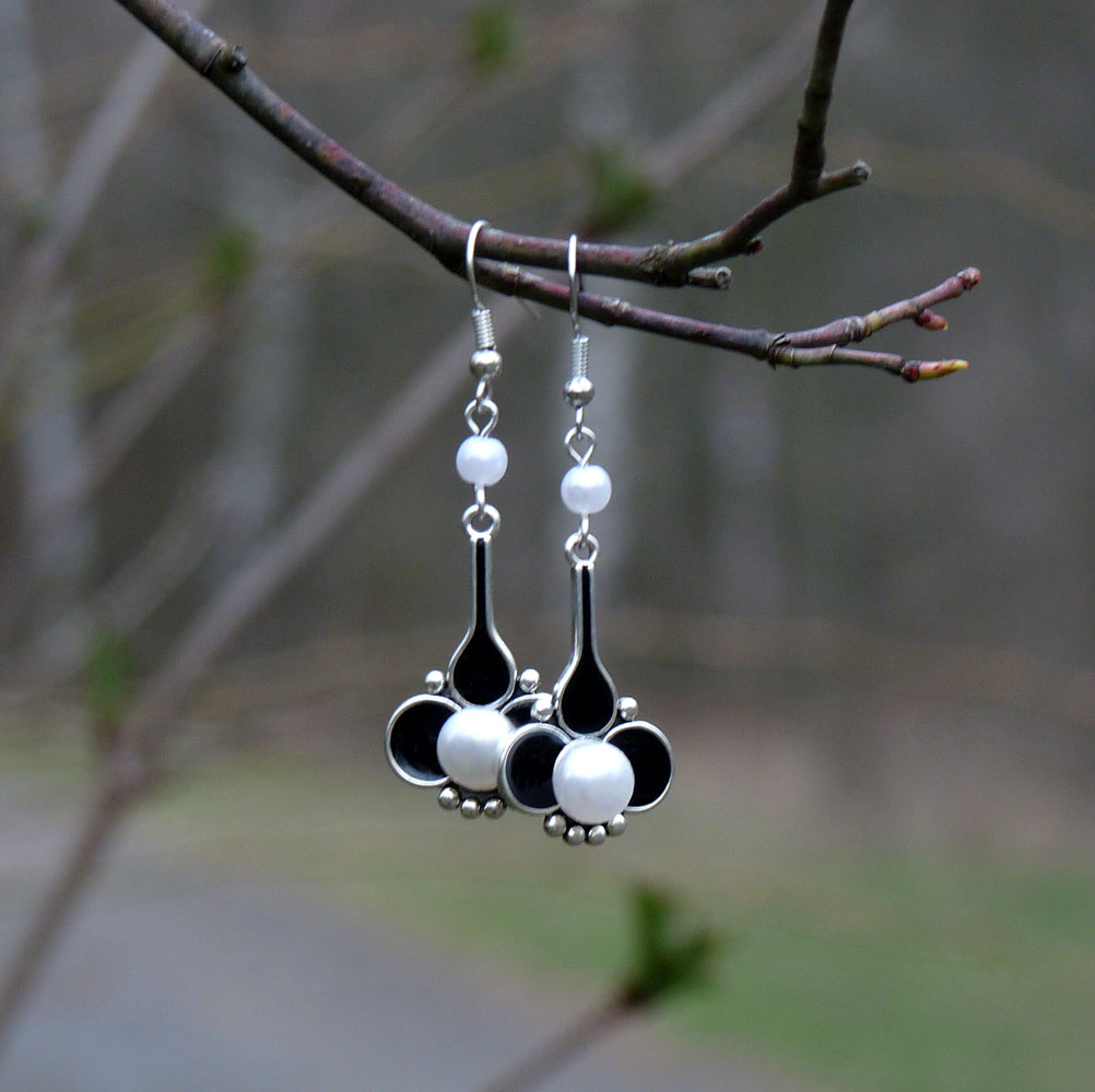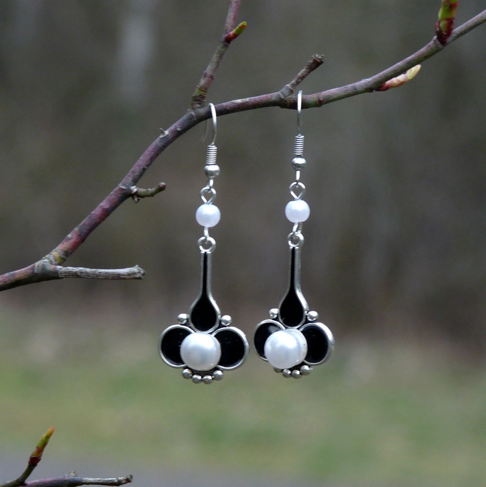 Elegantní delší náušnice s květinovým černým přívěskem s vlepenou perličkou