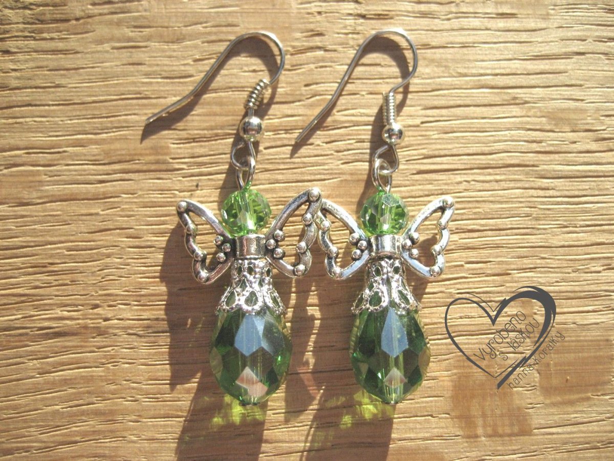 Andělské náušnice - andílci - andělíčci v kombinaci korálku v barvě - zelené čiré s AB efektem a stříbrných bižuterních komponentů, délka 2,9 cm + náušnicový háček