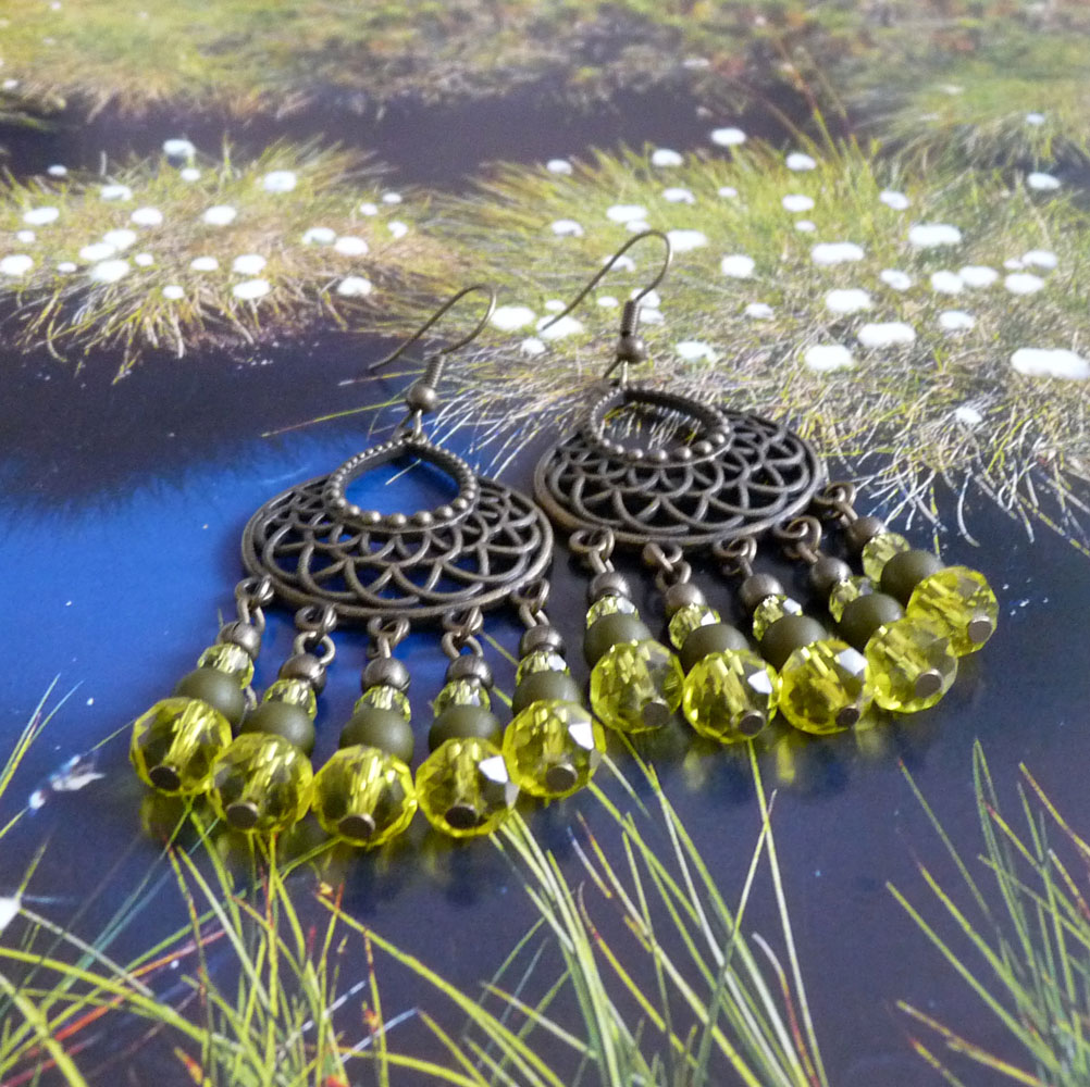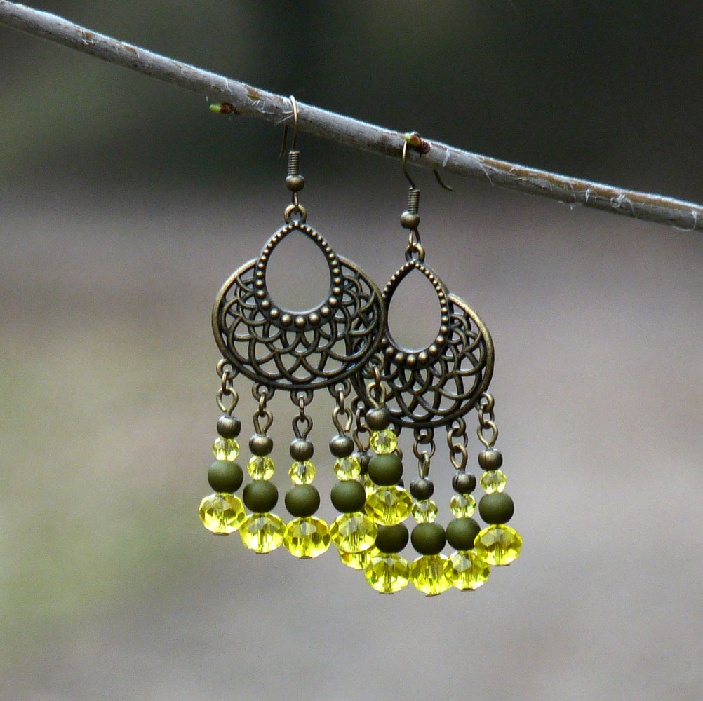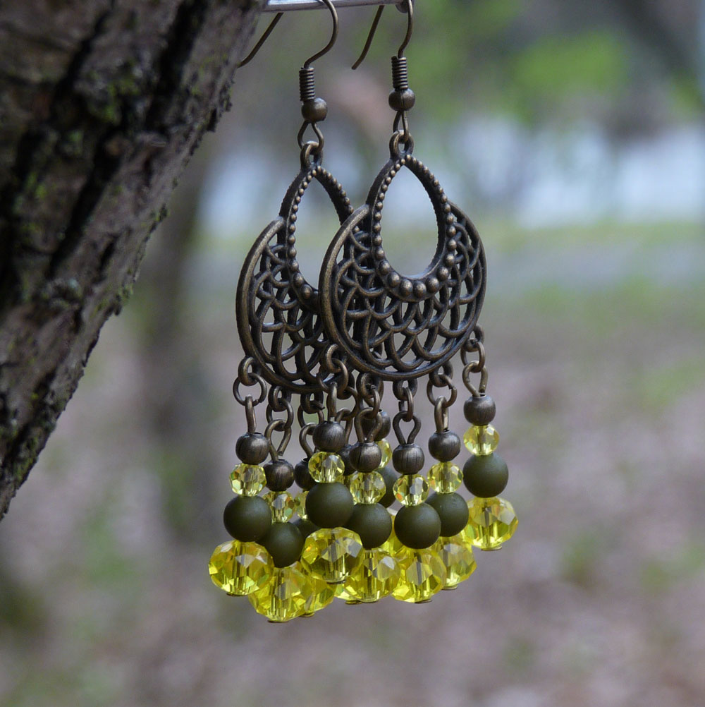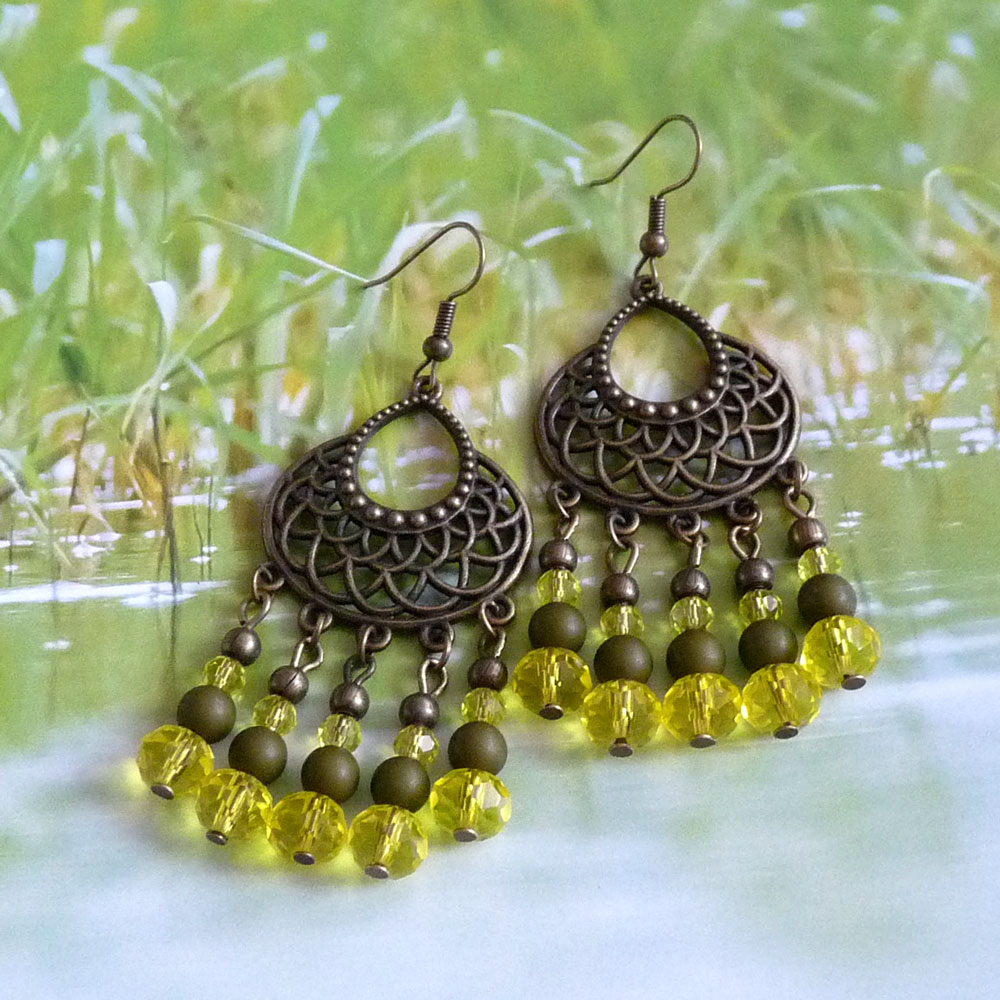 Tvoří je ozdobné ramínko, na kterém jsou závěsy tvořené broušenými žlutými korálky dvou velikostí, dřevěnými korálky v barvě khaki a kovovými bronzovými kuličkami