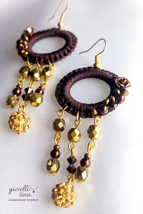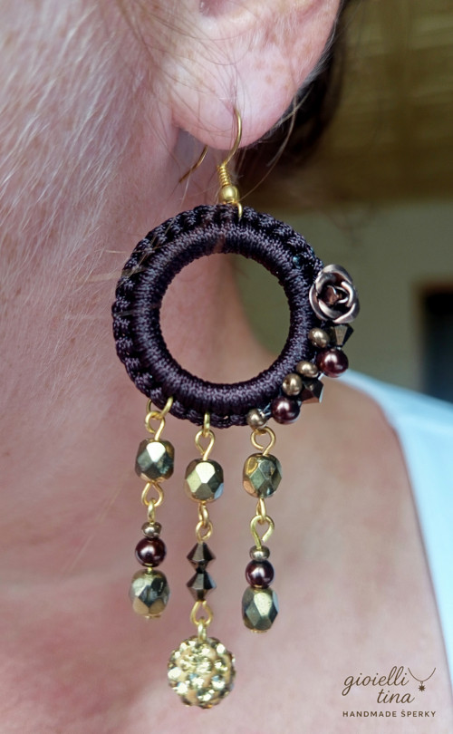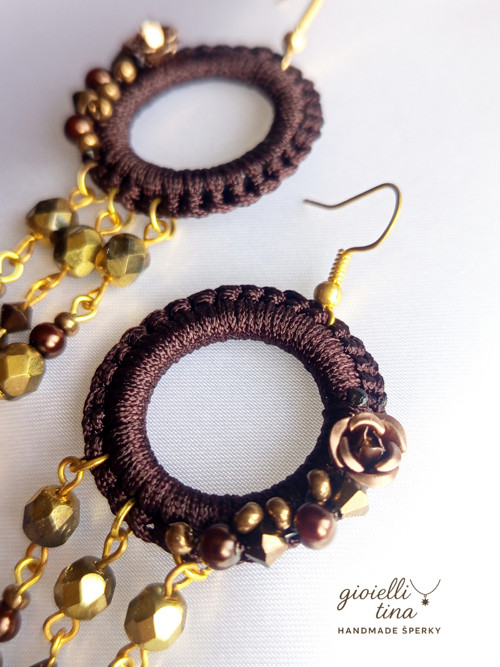 Tyto elegantní ručně vyráběné náušnice se vyznačují kruhovým tvarem obaleným tmavě hnědou voskovou šňůrkou , která jim dodává příjemnou texturu. Kruhy jsou ozdobeny drobnými kovovými růžemi a shluky korálků. Pod nimi visí kaskáda zlatavých a bronzových- hnědých korálků různých tvarů a velikostí, doplněná o výrazný, texturovaný zlatý korálek, který celému designu dodává luxusní a etnický nádech.