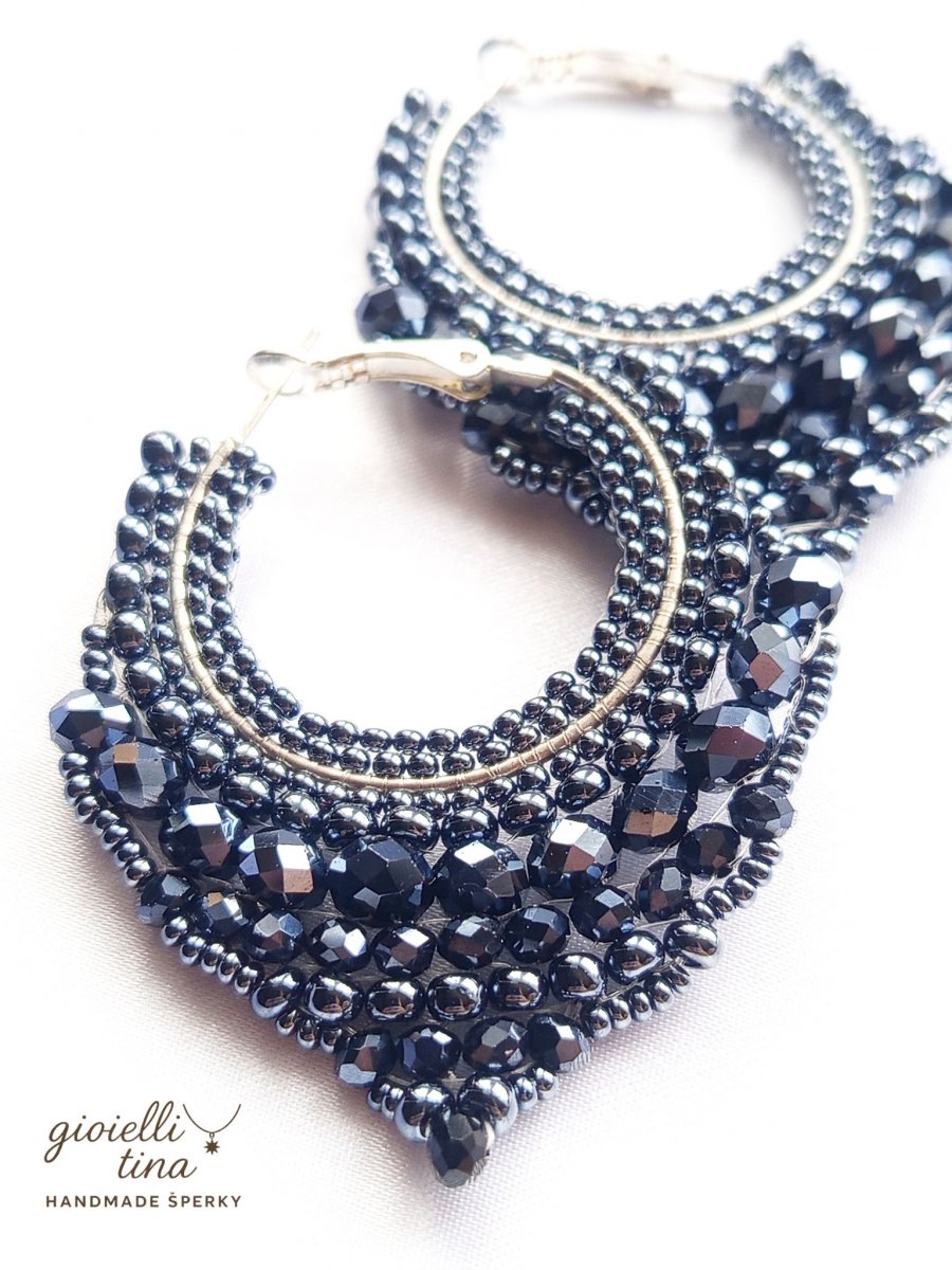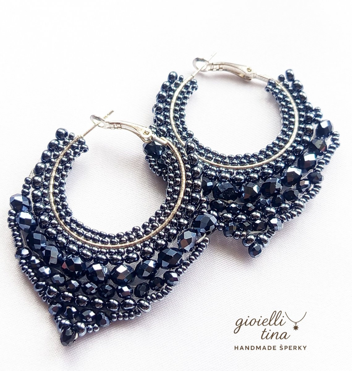Elegantní ručně vyráběné náušnice , zdobené drobným antracitovým rokajlem a broušenými kamínky, které jim dodávají třpyt a luxusní vzhled. Tyto statement náušnice s výrazným tvarem a bohatou texturou jsou ideálním doplňkem pro ženu, která miluje originální, kvalitní a nepřehlédnutelné šperky