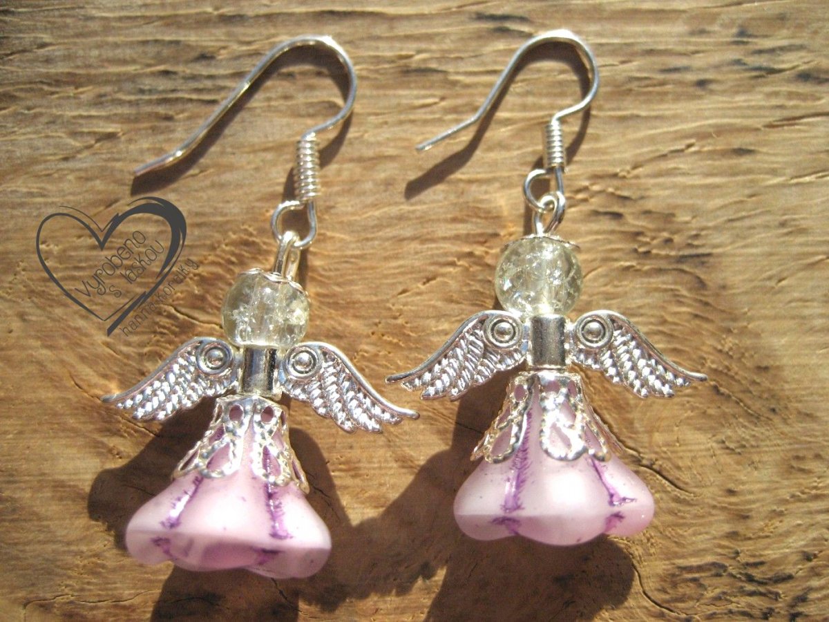 Andělské náušnice - andílci - andělíčci v kombinaci broušeného korálku v barvě - fialové - fuchsiové, čiré a stříbrných bižuterních komponentů, délka 2,5 cm + náušnicový háček