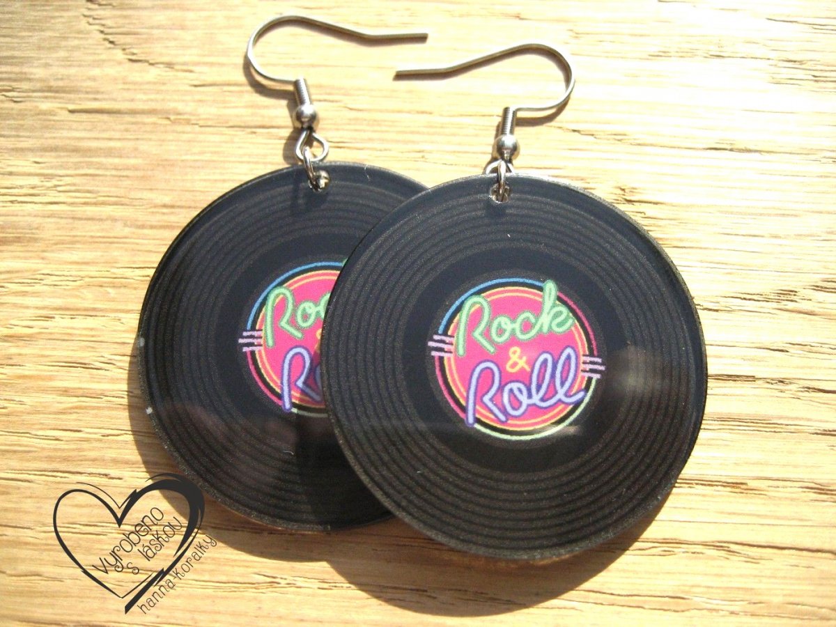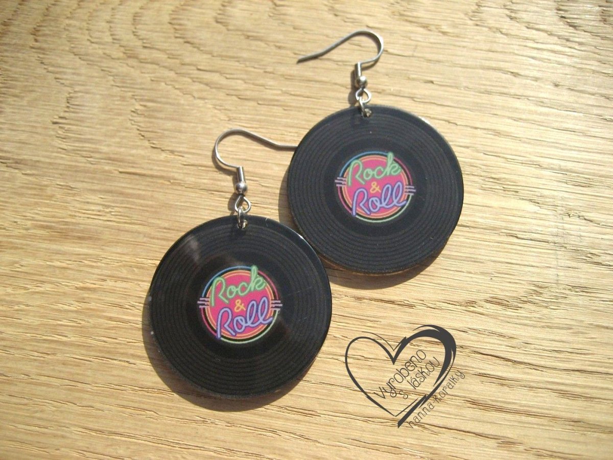 Veselé, hravé akrylové retro náušnice pro milovnice hudby a rock&rollu obzvlášť - gramofonové desky, vinyl , LP - průměr motivu 3,7 + naušnicový háček z nerez oceli