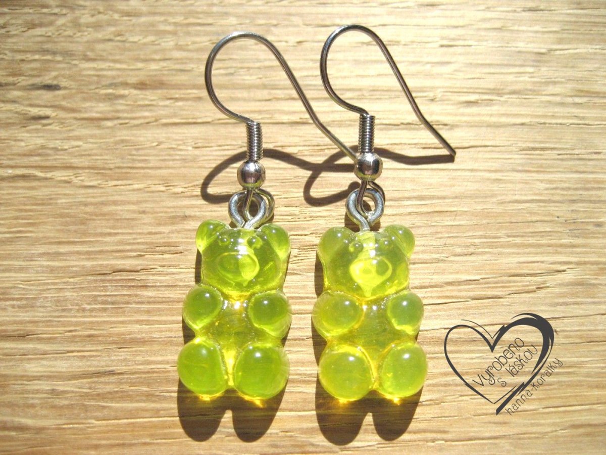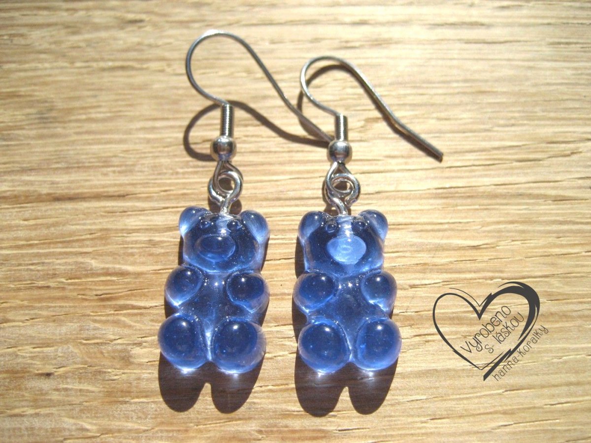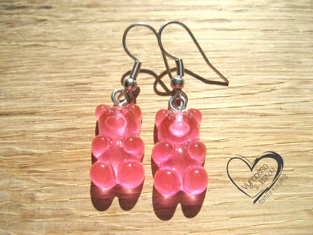 Veselé, hravé náušnice z pryskyřice - gumový medvídek ve 12 barvách - oranžová, fialová, tyrkysová, žlutá, bílá, černá, světle růžová, světle oranžová, růžová, modrá, bílá čirá, zelená - délka náušnic 3,7cm včetně náuš. háčku z nerez oceli, uvedená cena je za jeden pár náušnic, do poznámky uveďte vybranou barvu