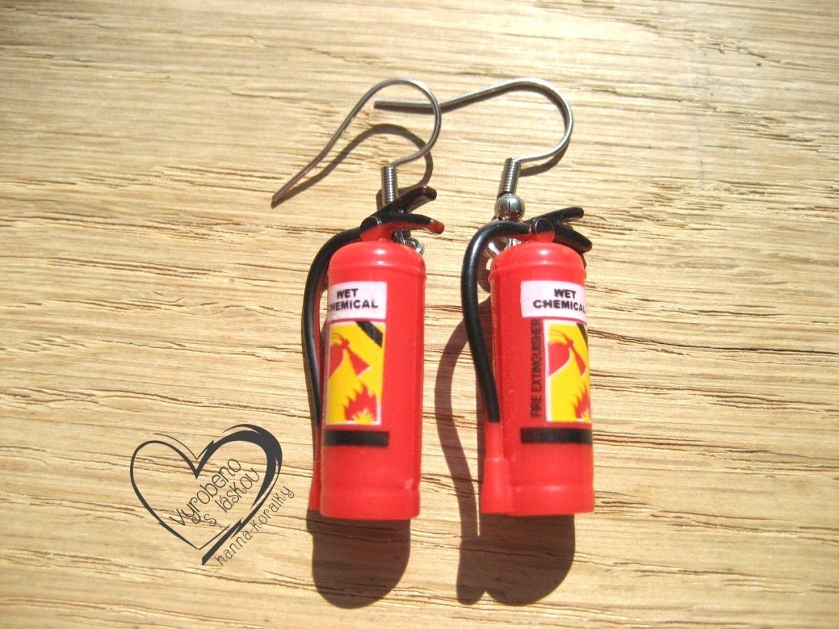 Vtipné hasičské náušnice z pryskyřice - mini hasičák - hasičský přístroj - výška motivu 2,7 cm + náušnicový háček z nerez oceli