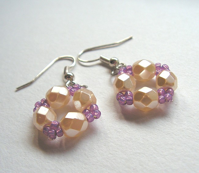Náušnice ušité z broušených skleněných korálků - ohňovek - a japonských korálků TOHO, délka náušnic bez háčku je 2 cm.