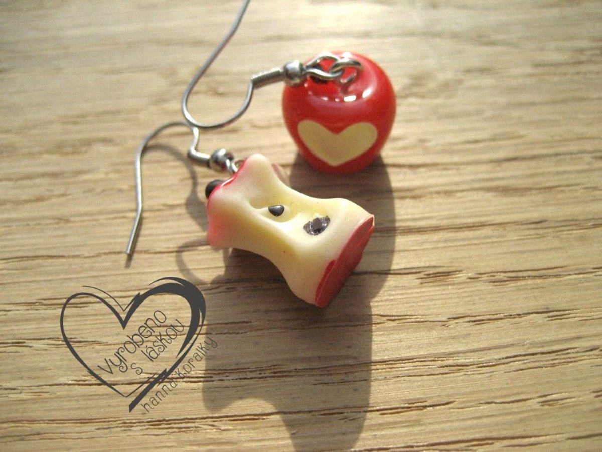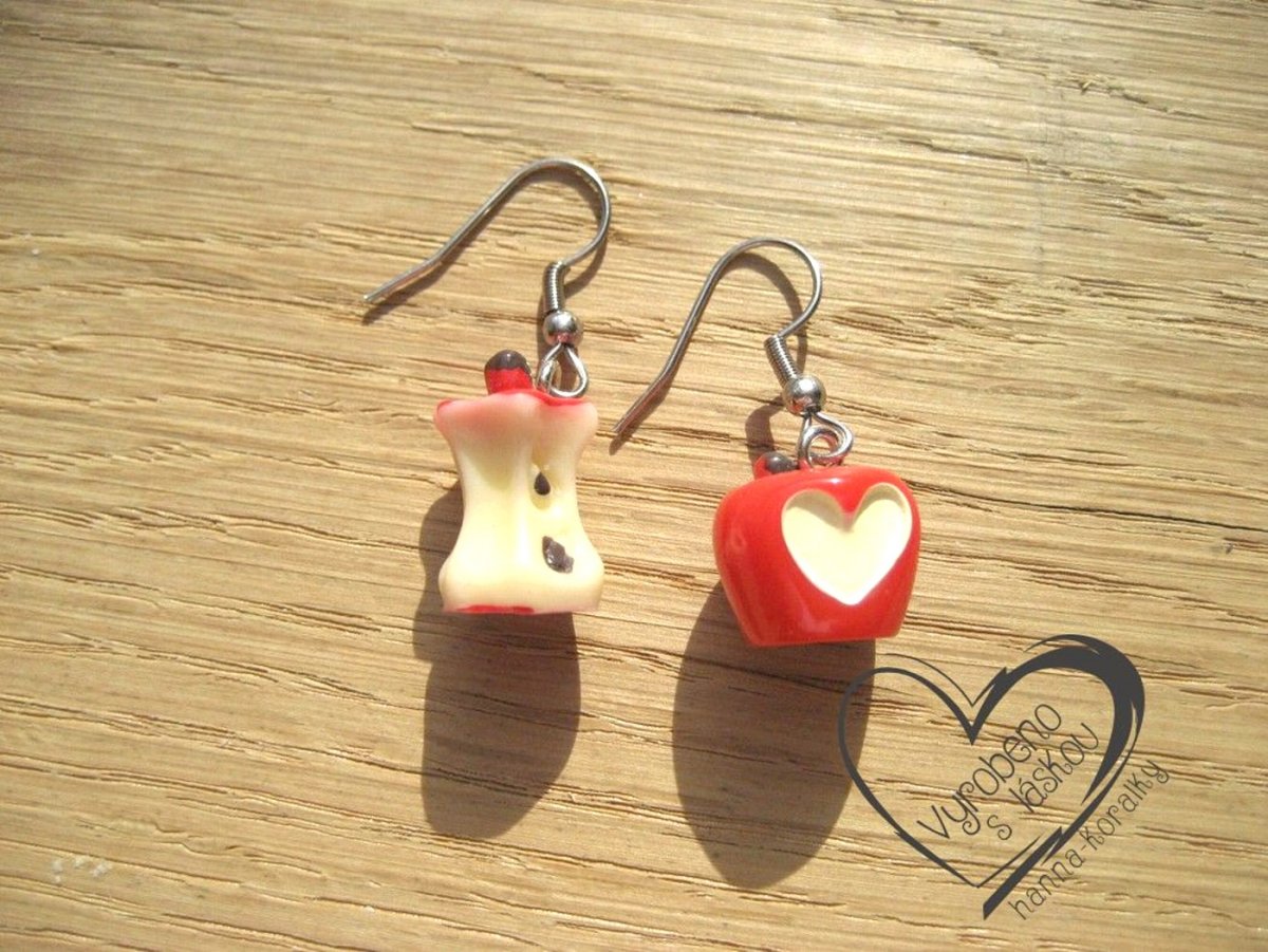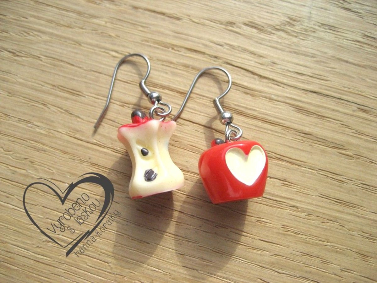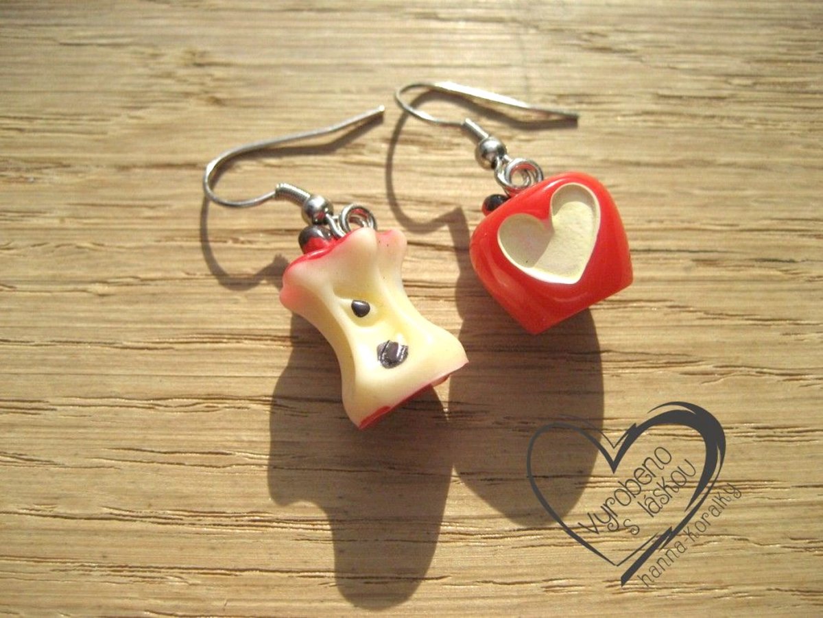 Veselé, hravé náušnice z pryskyřice - jablíčko se srdíčkem a snědené jablko neboli ohryzek - délka motivu 1,4 a 1,7 cm + očko a náušnicový háček z nerez oceli