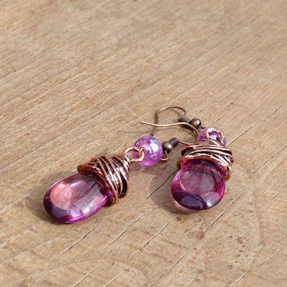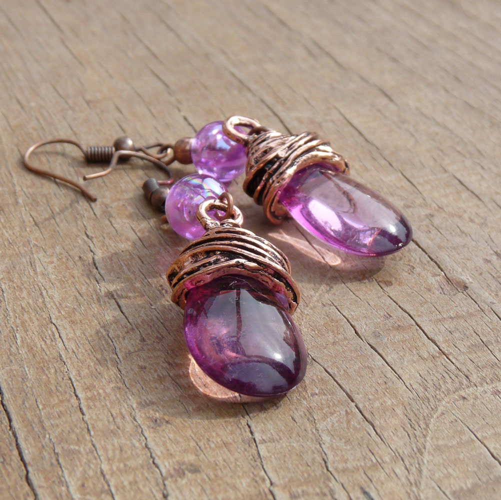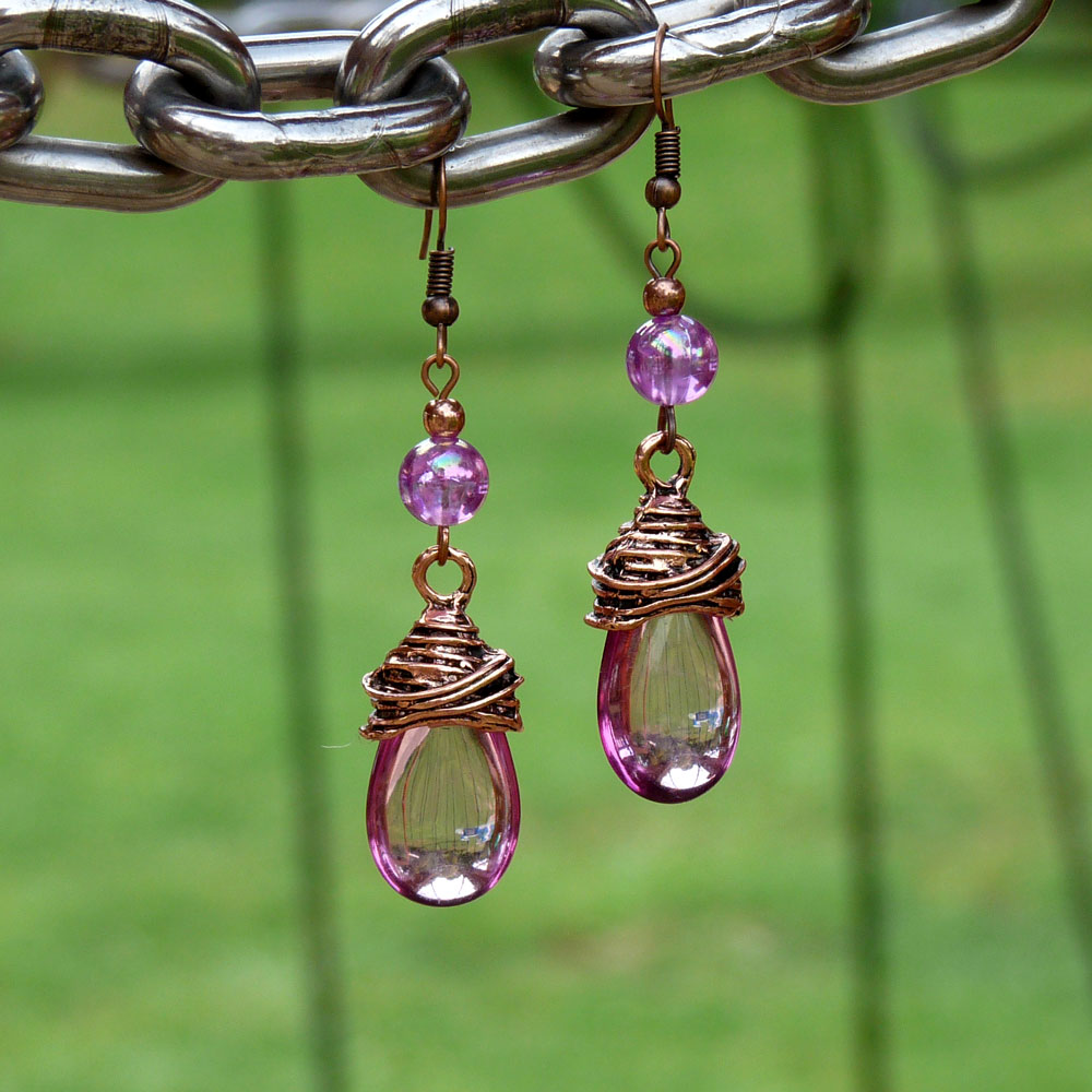 Visací delší náušnice s průhlednými kapkami ve fialové barvě