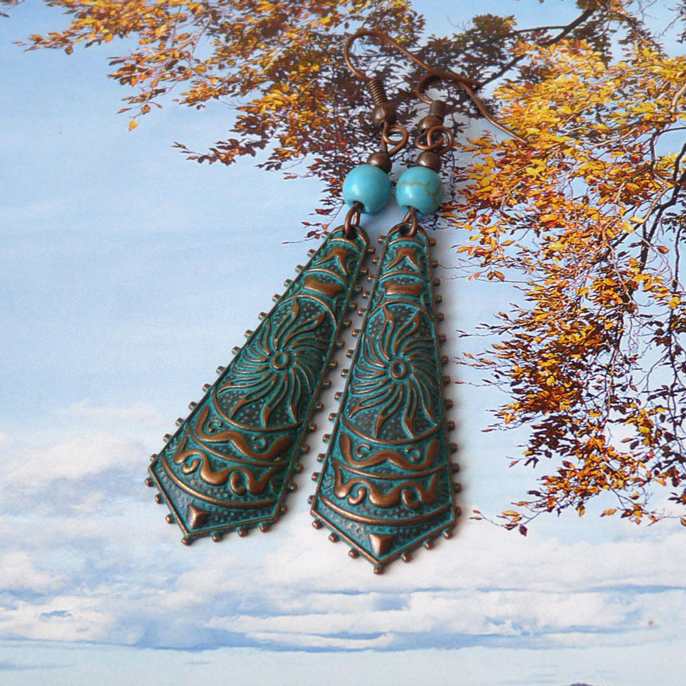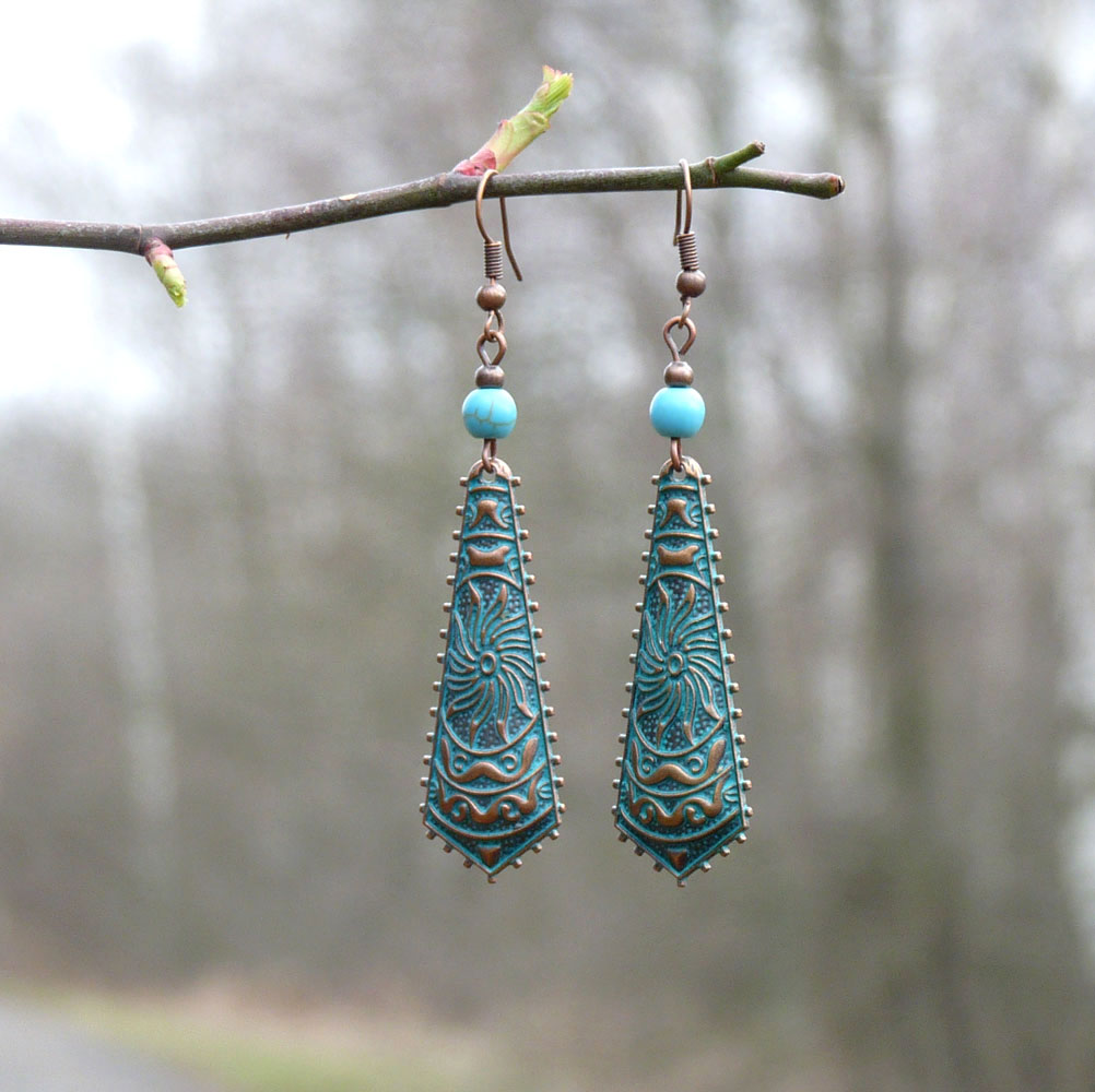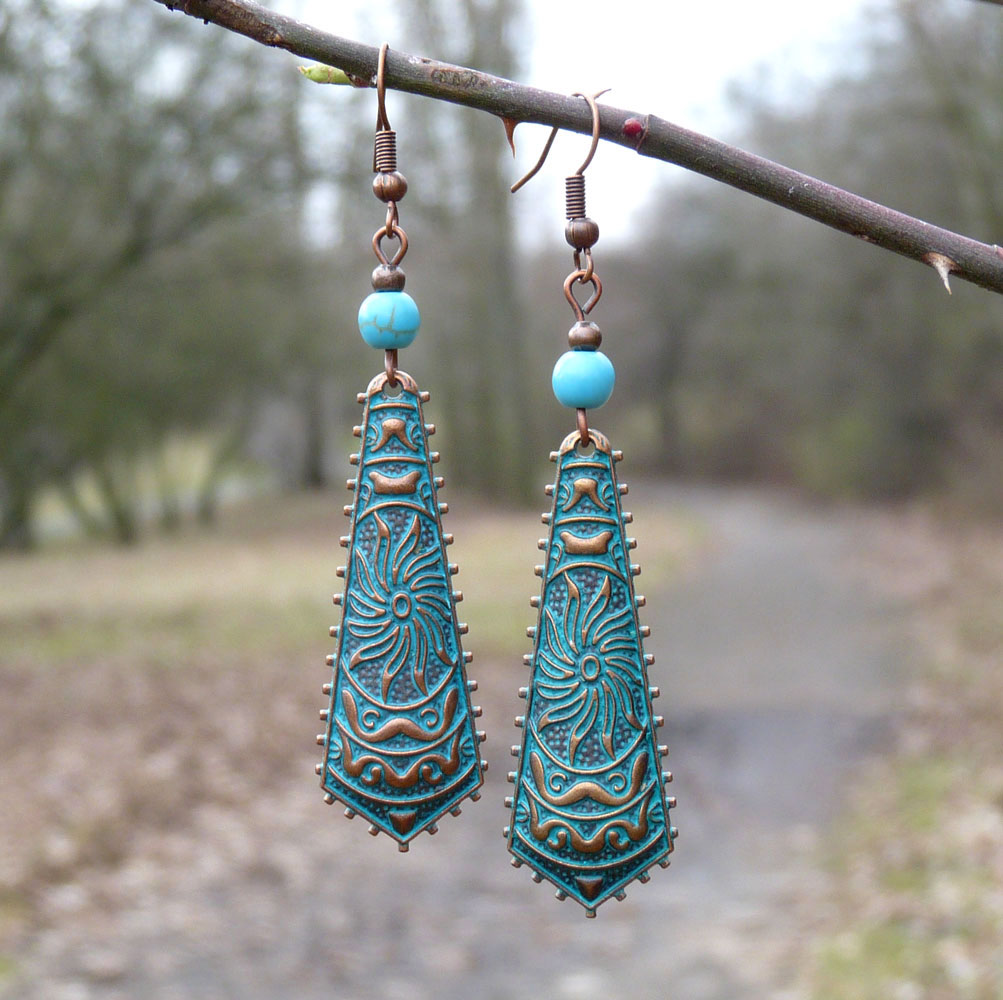 Visací náušnice s atraktivním tepaným přívěskem slunce ve stylu vintage