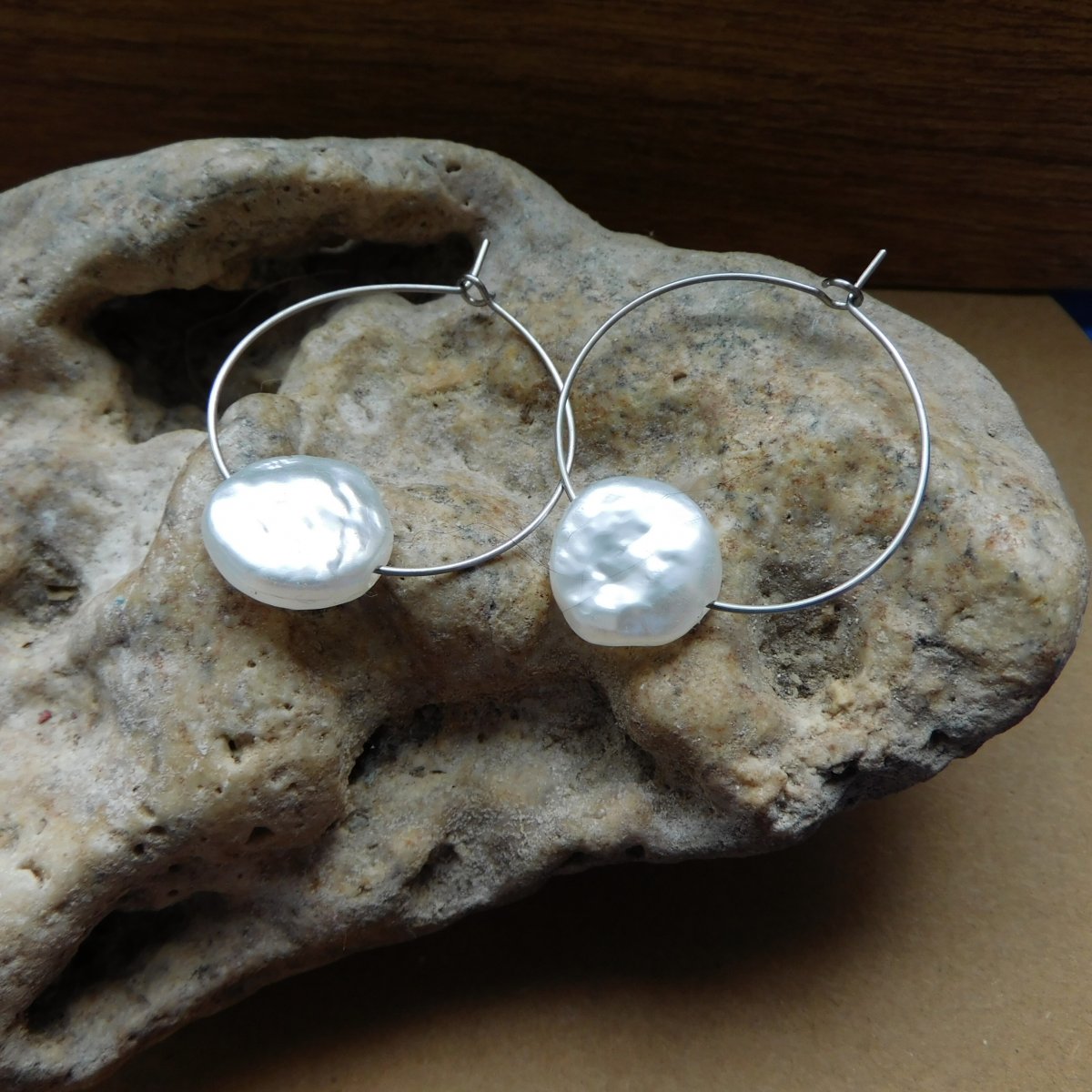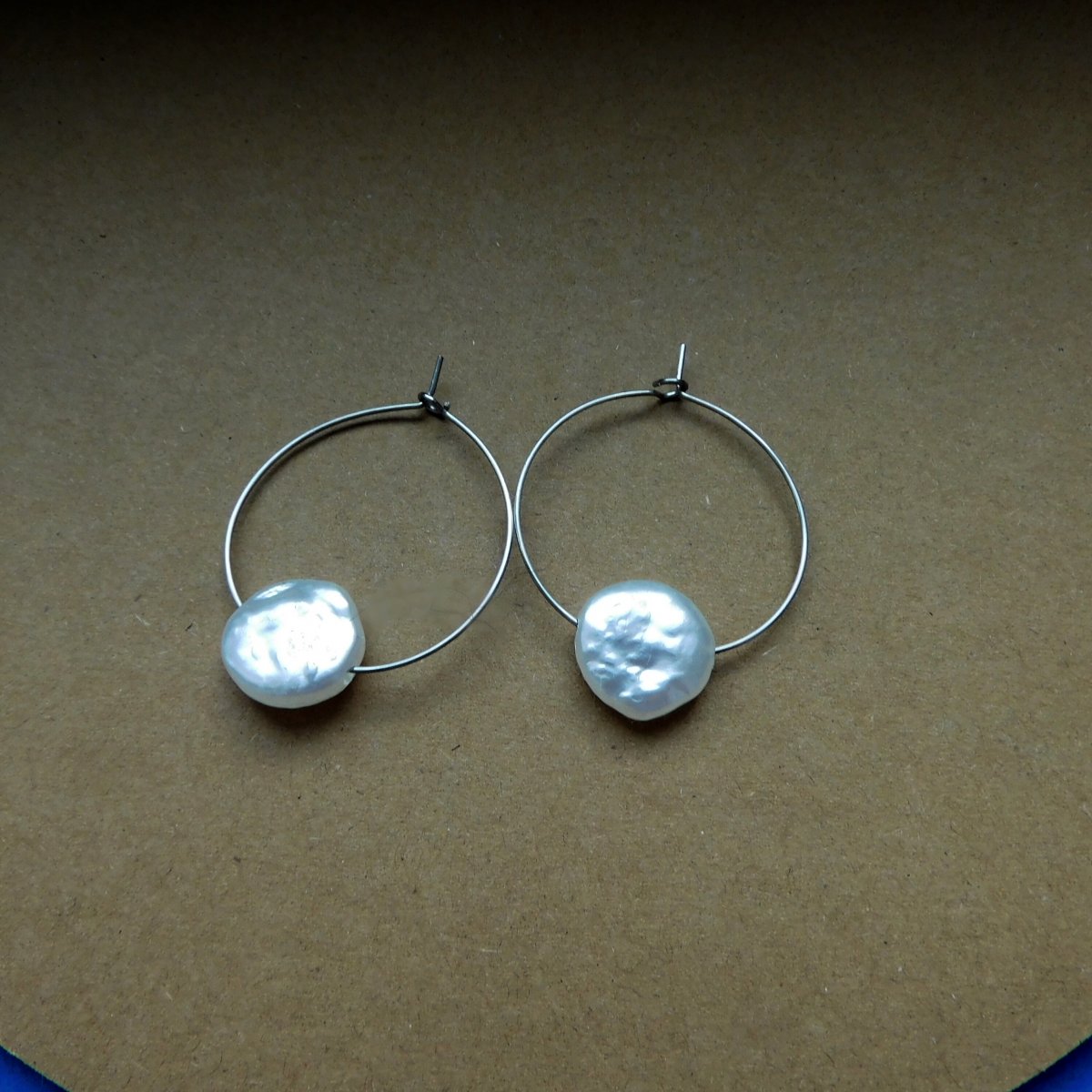 Naušnice vyrobené z protialergické nerezové oceli , nevyvolává alergie, ani nečerná a nemění barvu, doplněné bílými syntetickými perlami. Na jaro a léto jak dělané