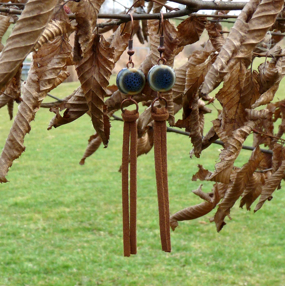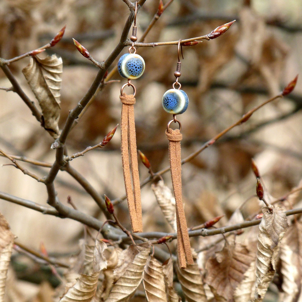 Dlouhé náušnice tvořené z kožených šňůrek a keramického korálku v modré barvě
