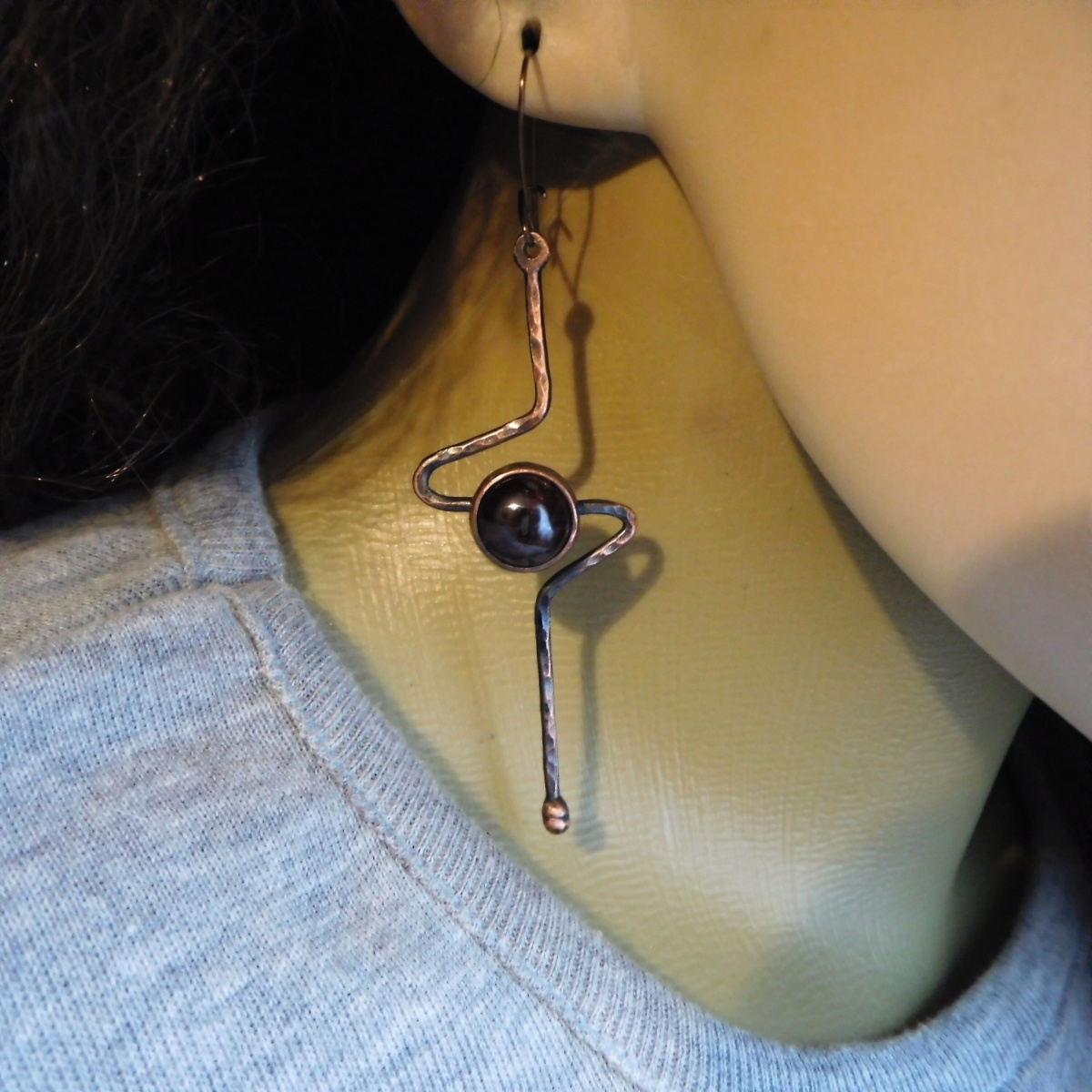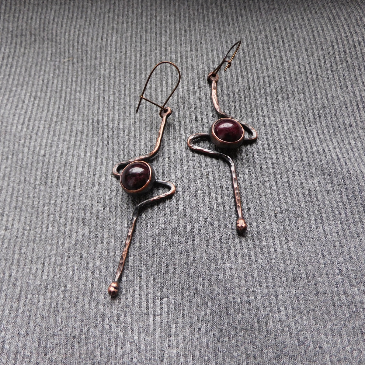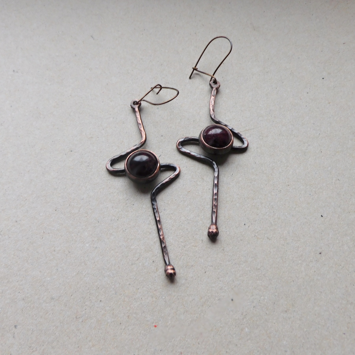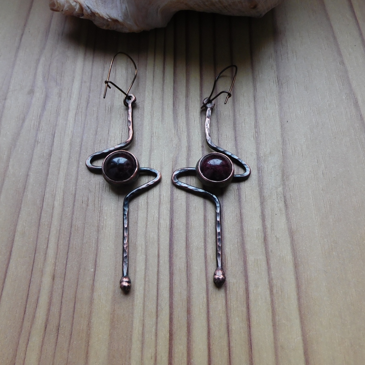 Měděné naušnice s indickým granátem vel. 10 mm. Délka naušnic je 6 cm, šířka v nejšiřší části 2,5 cm.