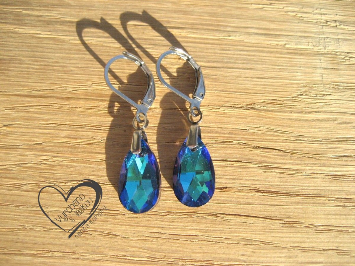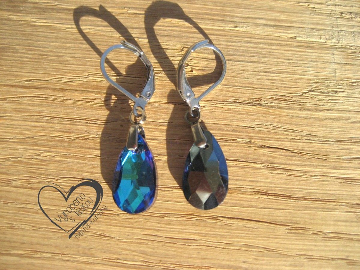 Jednoduché a zároveň velmi elegantní náušnice - skleněné, fasetované kapky v modré barvě zavěšené na uzavíratelném náušnicovém háčku z nerez oceli, délka náušnic vč. háčku 3,5cm, velikost samotného přívěsku 1,5 x 1 cm.