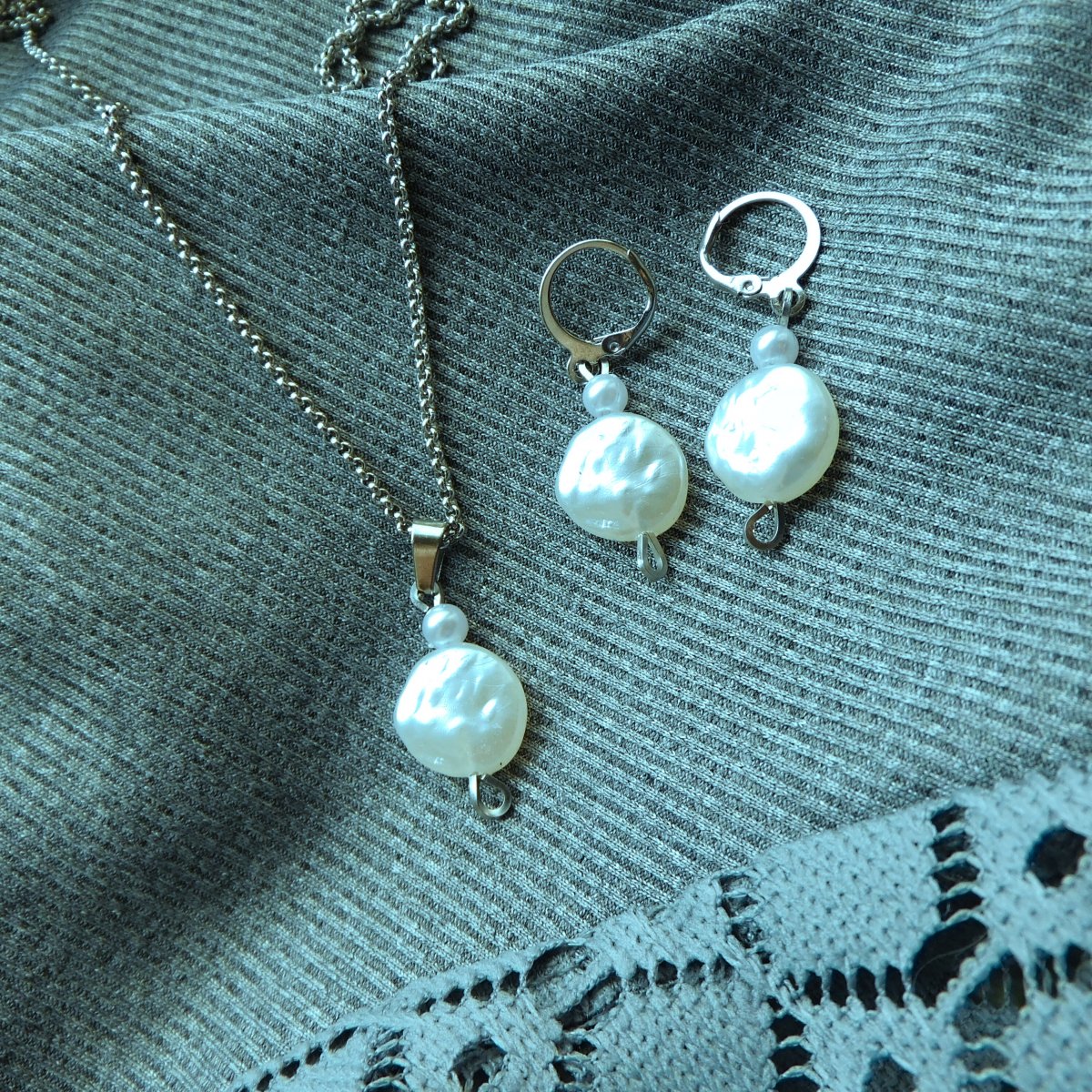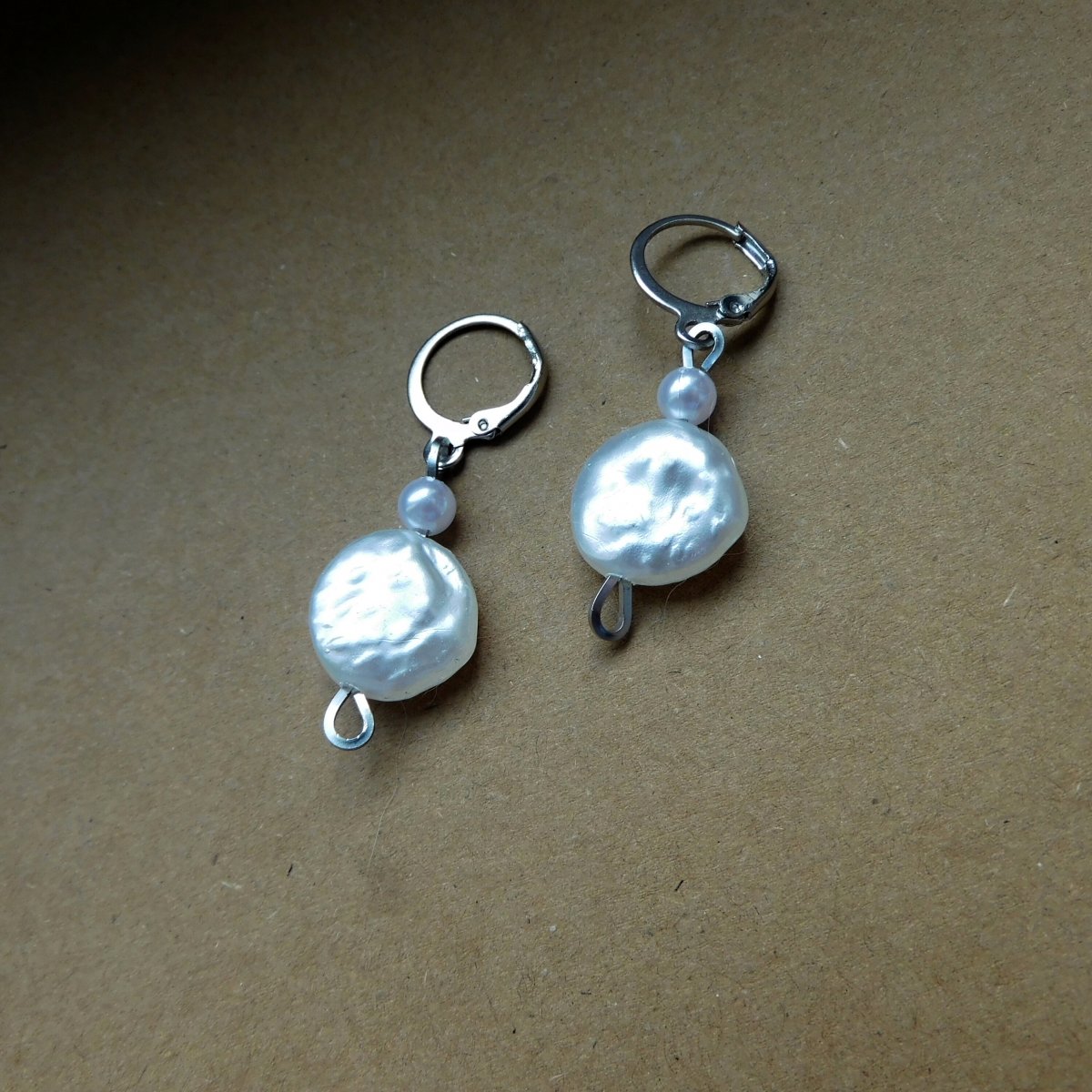 Naušnice vyrobené z protialergické nerezové oceli , nevyvolává alergie, ani nečerná a nemění barvu, doplněné bílými syntetickými keshi perlami. Na jaro a léto jak dělané