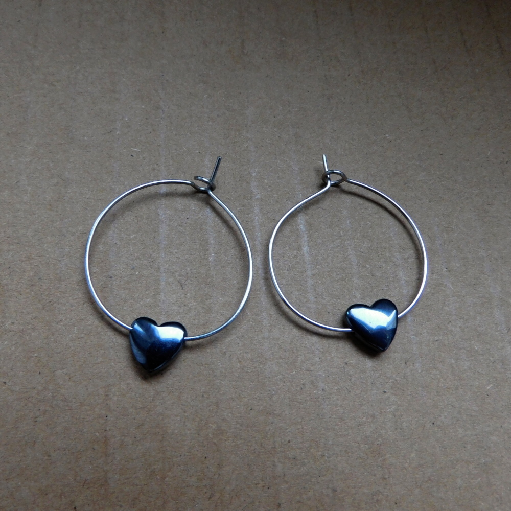 Naušnice kroužky z nerezu , navlečené malé hematitové srdíčko....