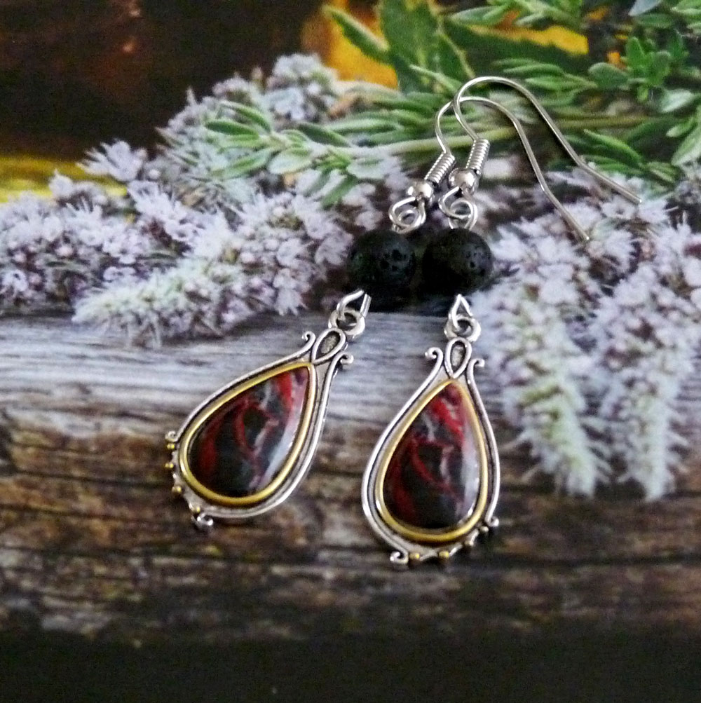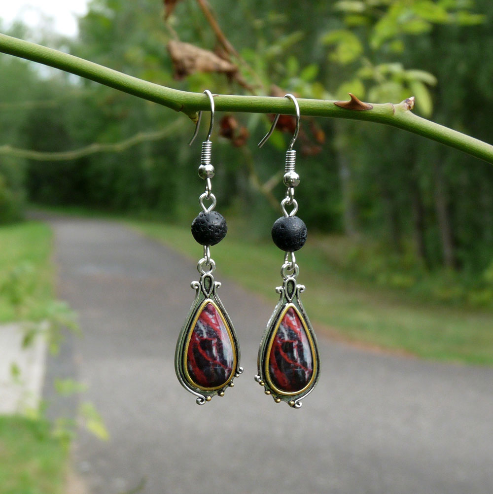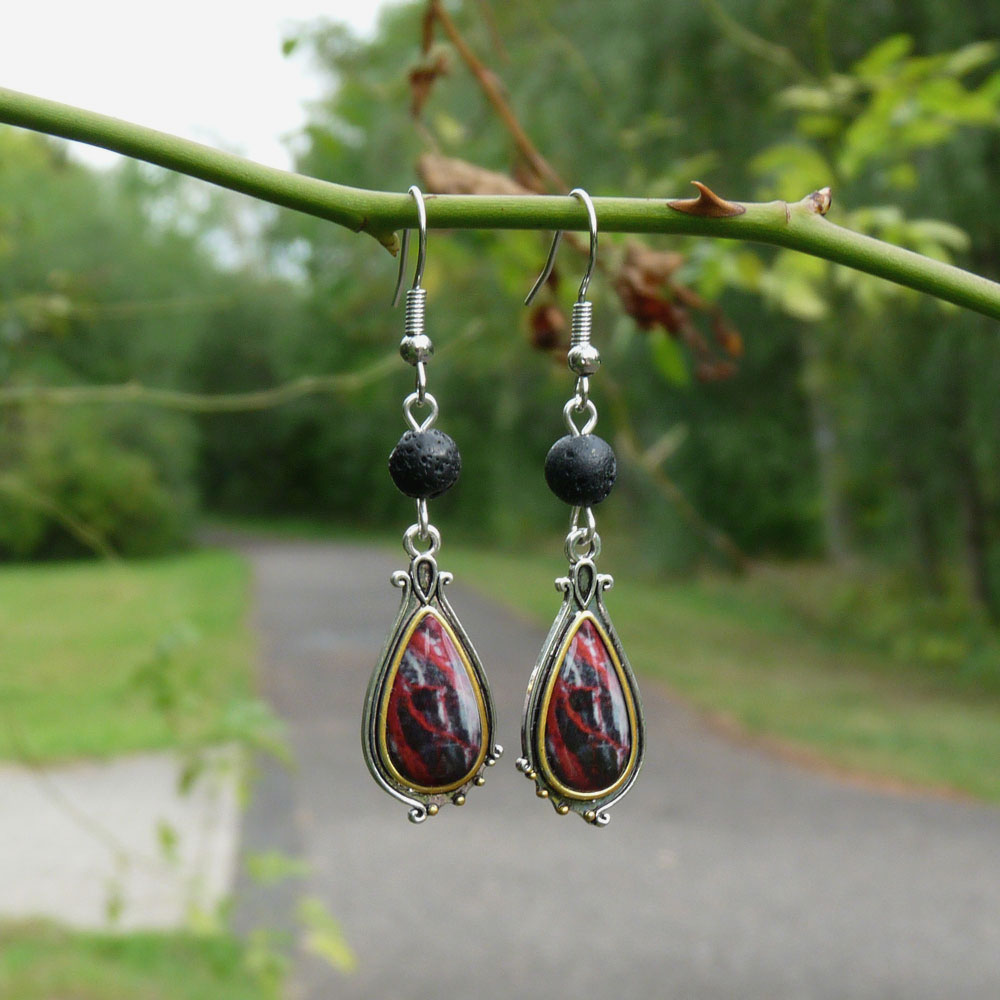 Náušnicím dominuje přívěsek s lůžkem vyplněným černočerveným motivem, zalitým křišťálovou pryskyřicí