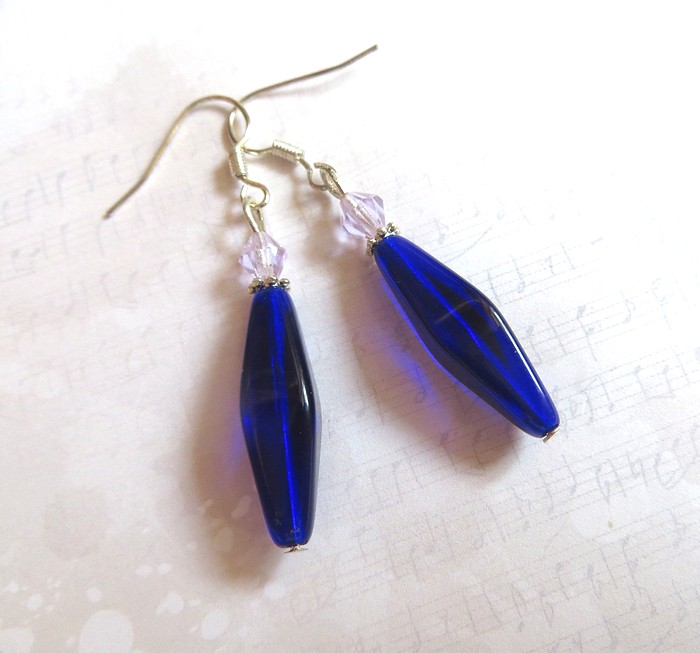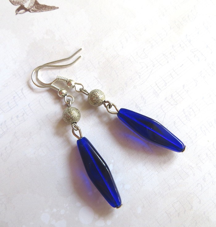 Náušnice vyrobené ze skleněných korálků, cínovek a komponentů z bižuterního kovu. Délka náušnic bez háčku je 3,5 cm.
