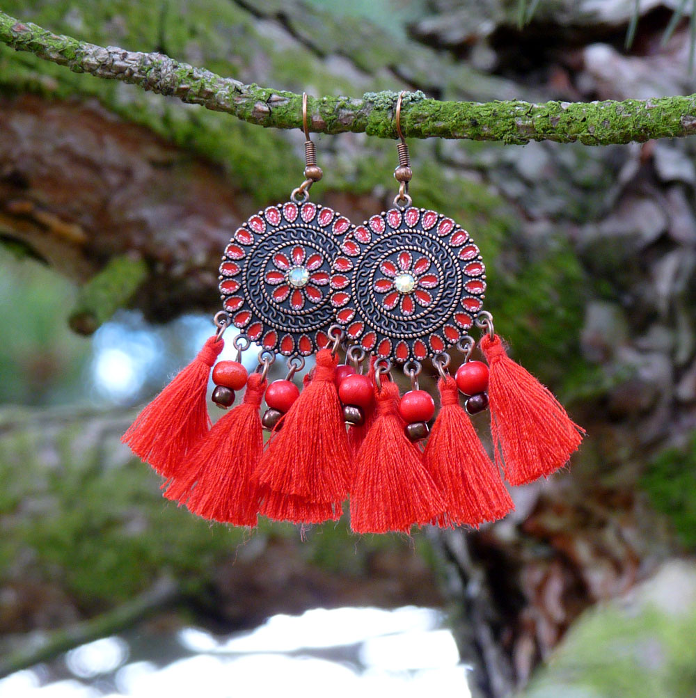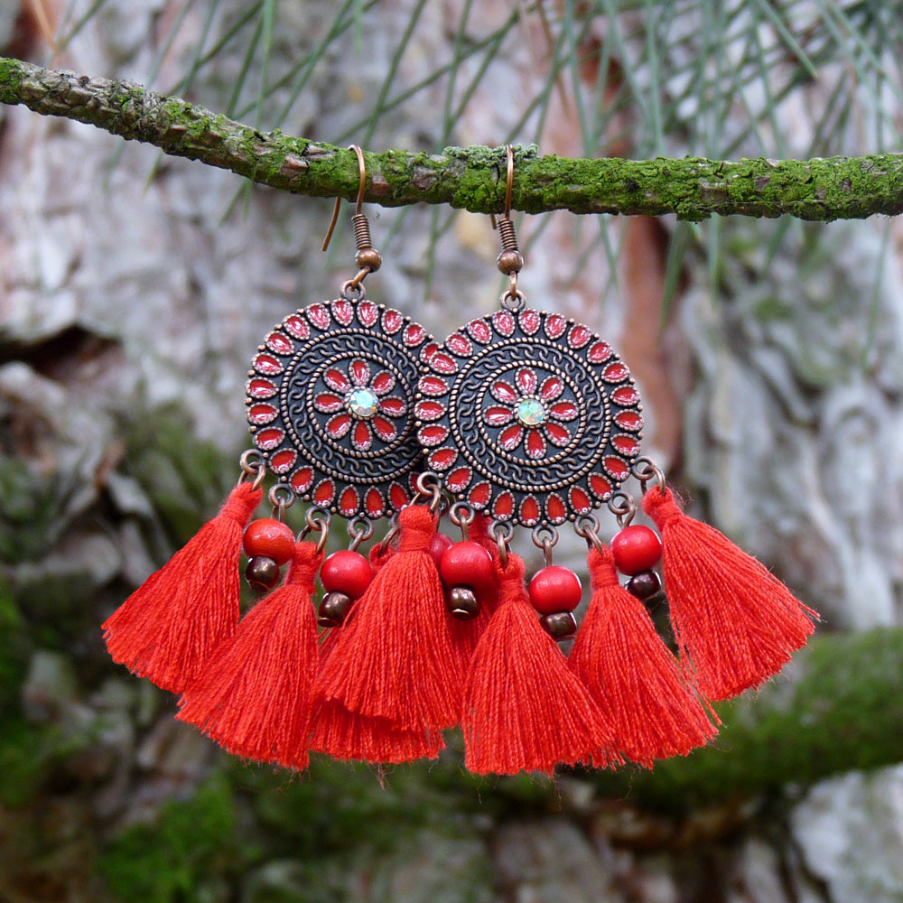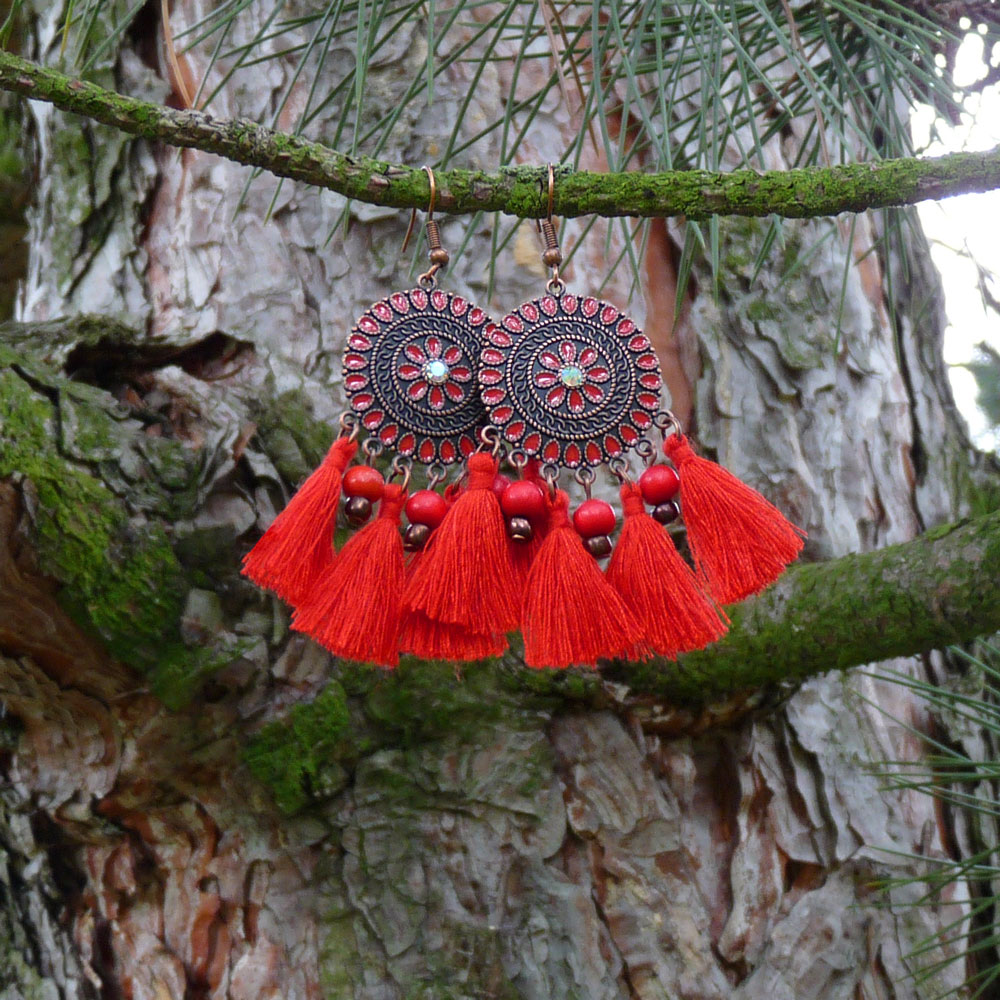 Pod přívěskem jsou zavěšeny červené střapečky z bavlněných nití