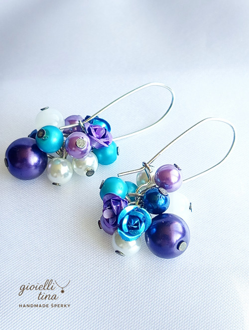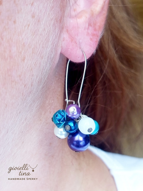 Náušnice jsou inspirované jarními květinami. Jsou tvořené shlukem voskových perel v různých odstínech modré, fialové a bílé. Kromě perleťových a lesklých korálků jsou zdobené kovovými růžičkami.