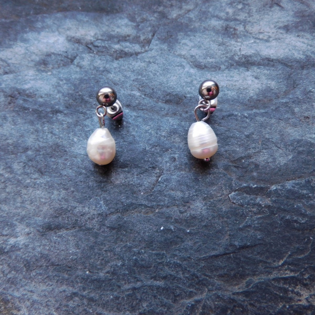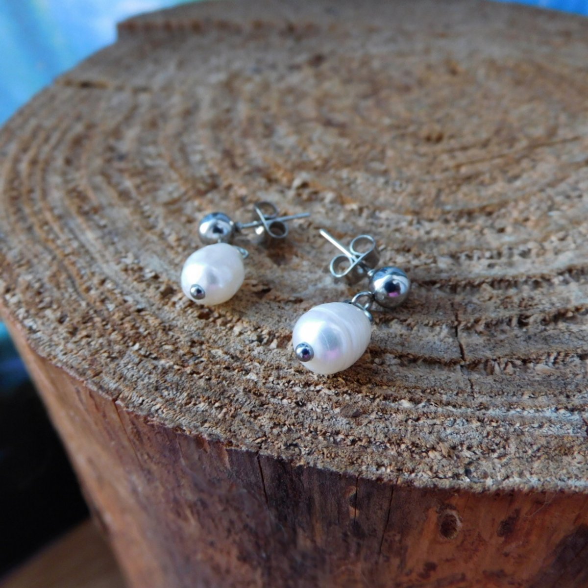Naušnice z nerezu ,tzv. napichovátka, kulička bílé perličky oválné, pravé říční.
