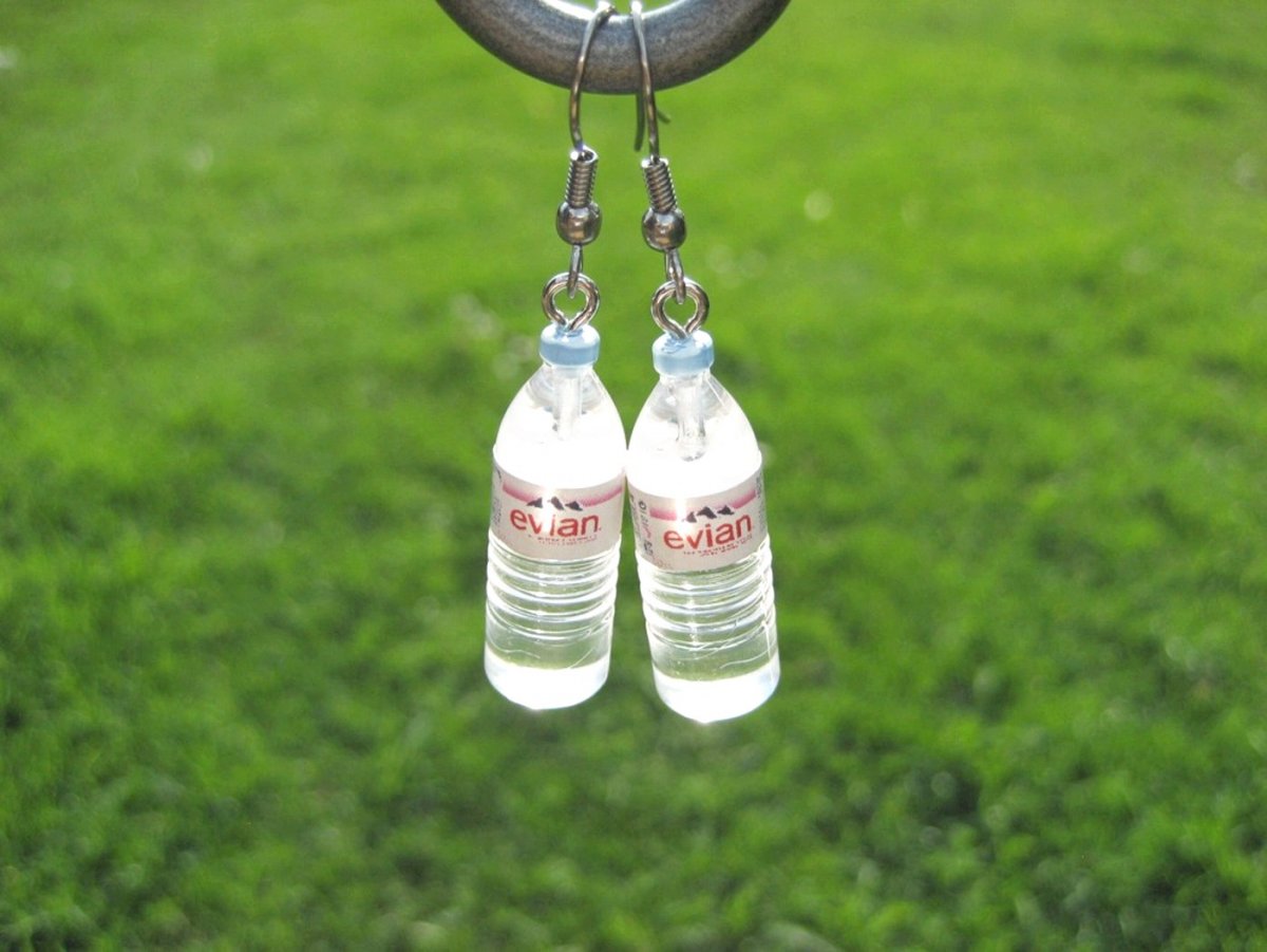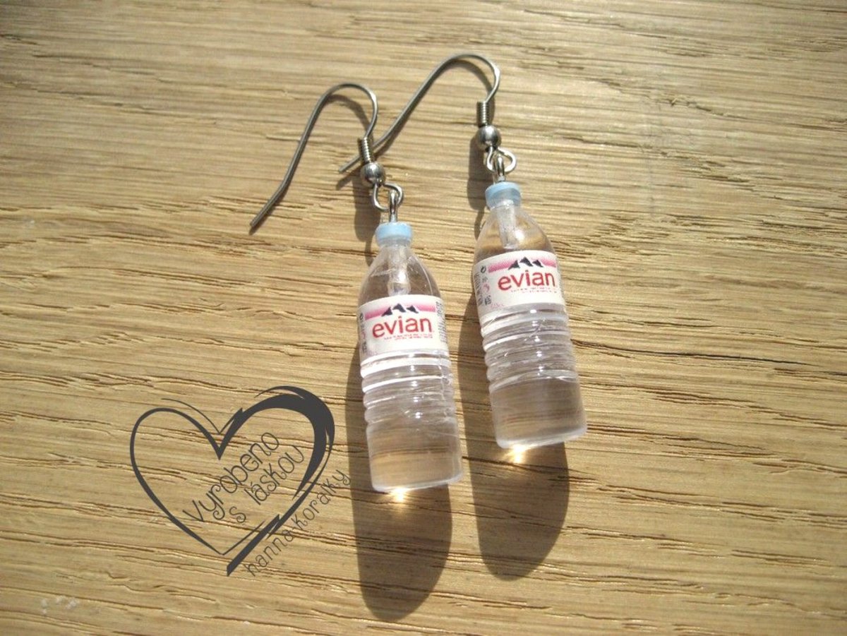 Vtipné náušnice z pryskyřice - mini pet láhev - minerální voda - výška motivu 3 cm + naušnicový háček z nerez oceli