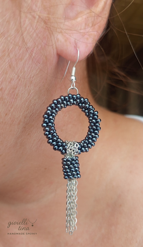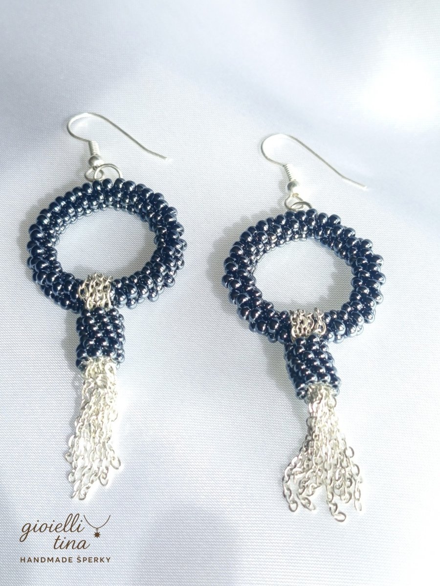 Náušnice jsou ručně vyrobené z antracitových rokajlů, které tvoří elegantní kruhový tvar, a pod nimi se třpytí stříbrné řetízky. Kruh z korálků připomíná noční oblohu, zatímco řetízky dodávají náušnicím pohyb a lesk.
