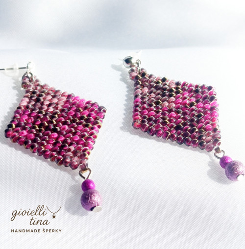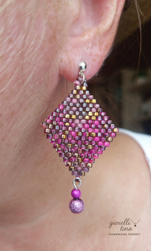 Tyto originální a elegantní náušnice jsou ručně šité z drobných korálků ve tvaru lesklého kosočtverce. Korálky v odstínech purpurové, růžové a hnědé jsou pečlivě uspořádány tak, že vytvářejí zajímavý pixelový efekt. Ve spodní části každé náušnice je zavěšený malý purpurový korálek s jemným třpytem, který dodává celku dynamiku. Náušnice se zapínají na puzetu a jsou ideálním doplňkem pro každodenní nošení i speciální příležitosti.