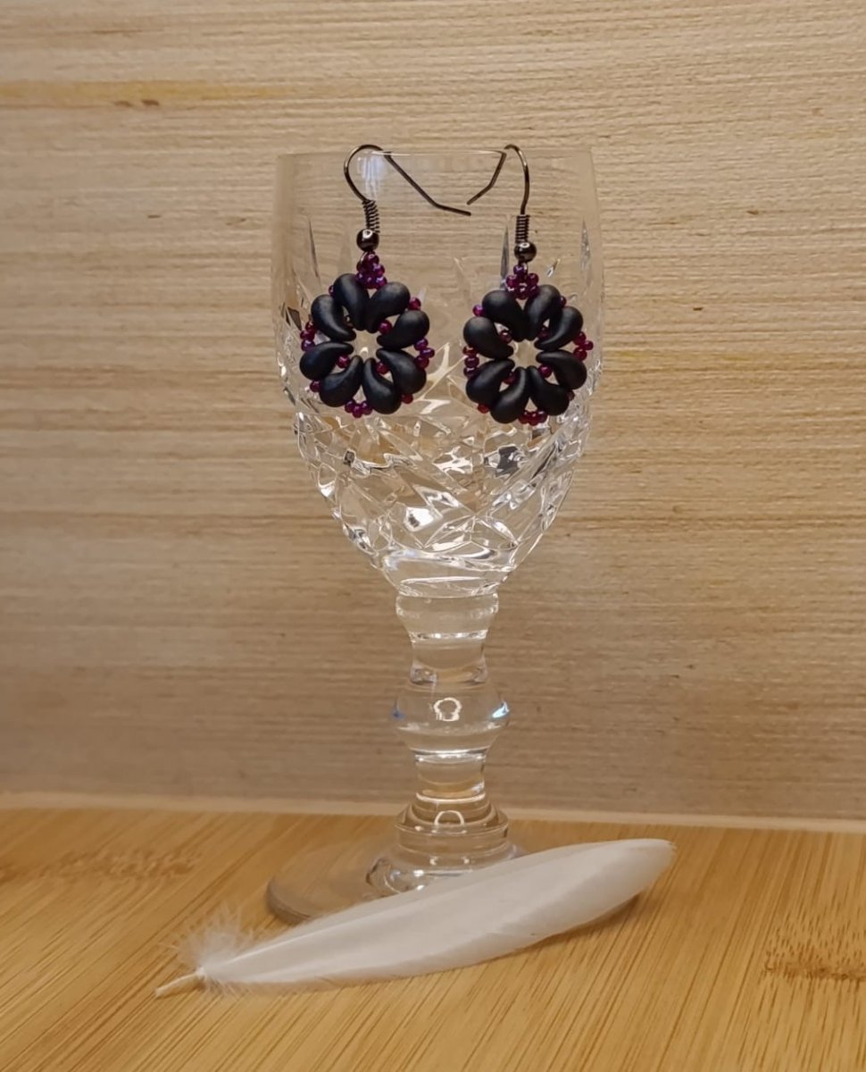 Náušnice šité vzorem "čtyřlístek" NYMO nití, z rokajlu a skleněných korálků Zoliduo barev černé/antracit.
