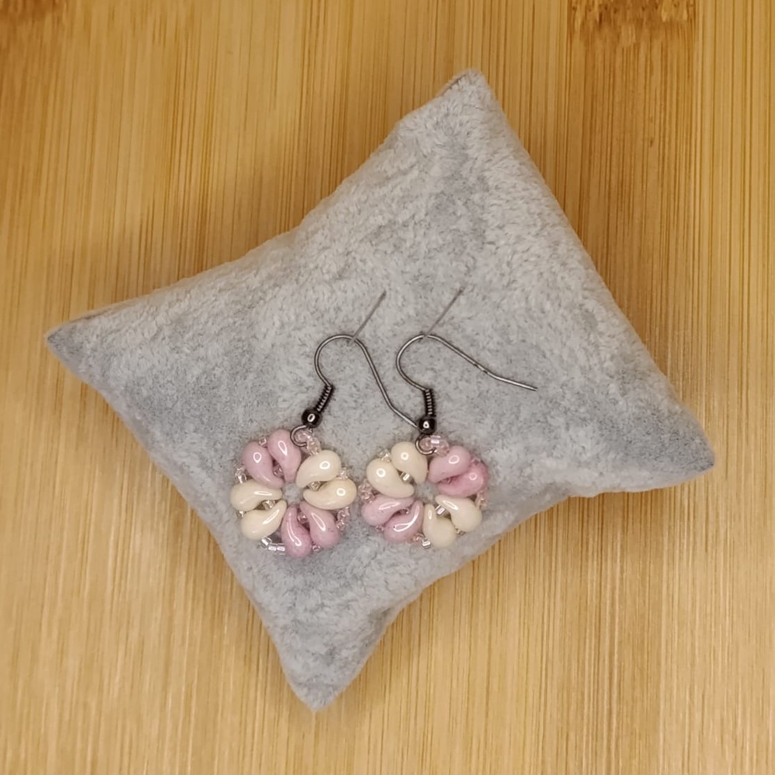 Náušnice šité vzorem "čtyřlístek" NYMO nití, z rokajlu a skleněných korálků Zoliduo barev růžové a béžové.