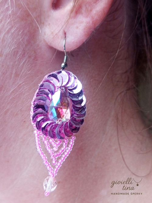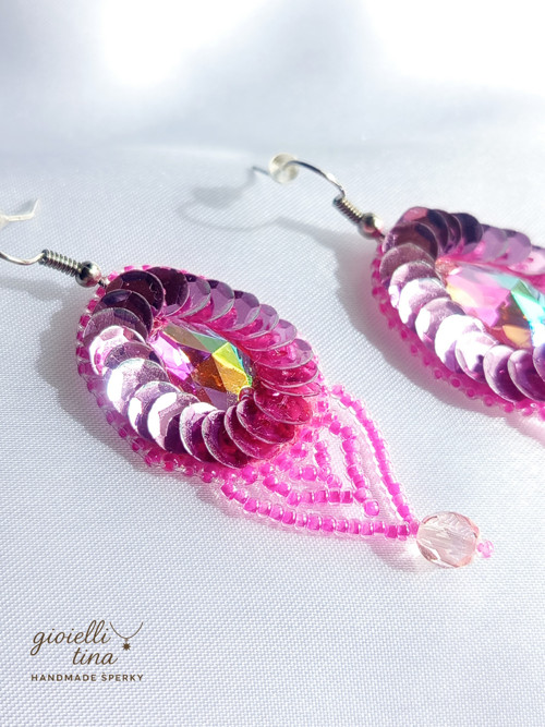 Tyto jedinečné náušnice jsou ručně vyšívané z růžových flitrů, které tvoří elegantní oválný tvar. Uvnitř oválu je umístěný fasetovaný korálek, který se třpytí všemi barvami duhy. Spodní část náušnic zdobí jemné řady drobných korálků, připomínající kapky vody.
