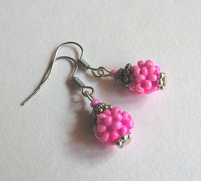 Náušnice vyrobené z kuliček ušitých z rokajlu a komponentů z bižuterního kovu. Délka náušnic bez háčku je 1,7 cm.