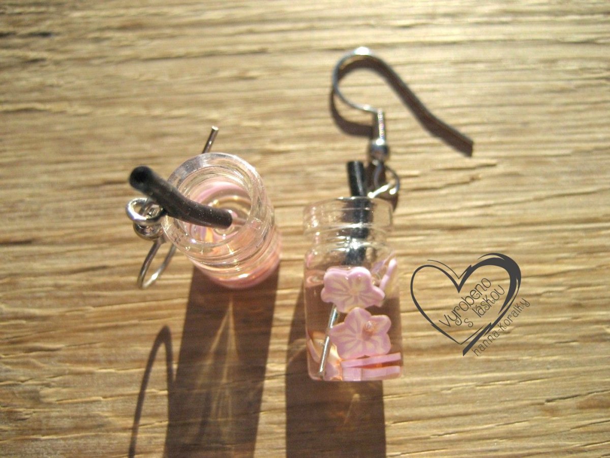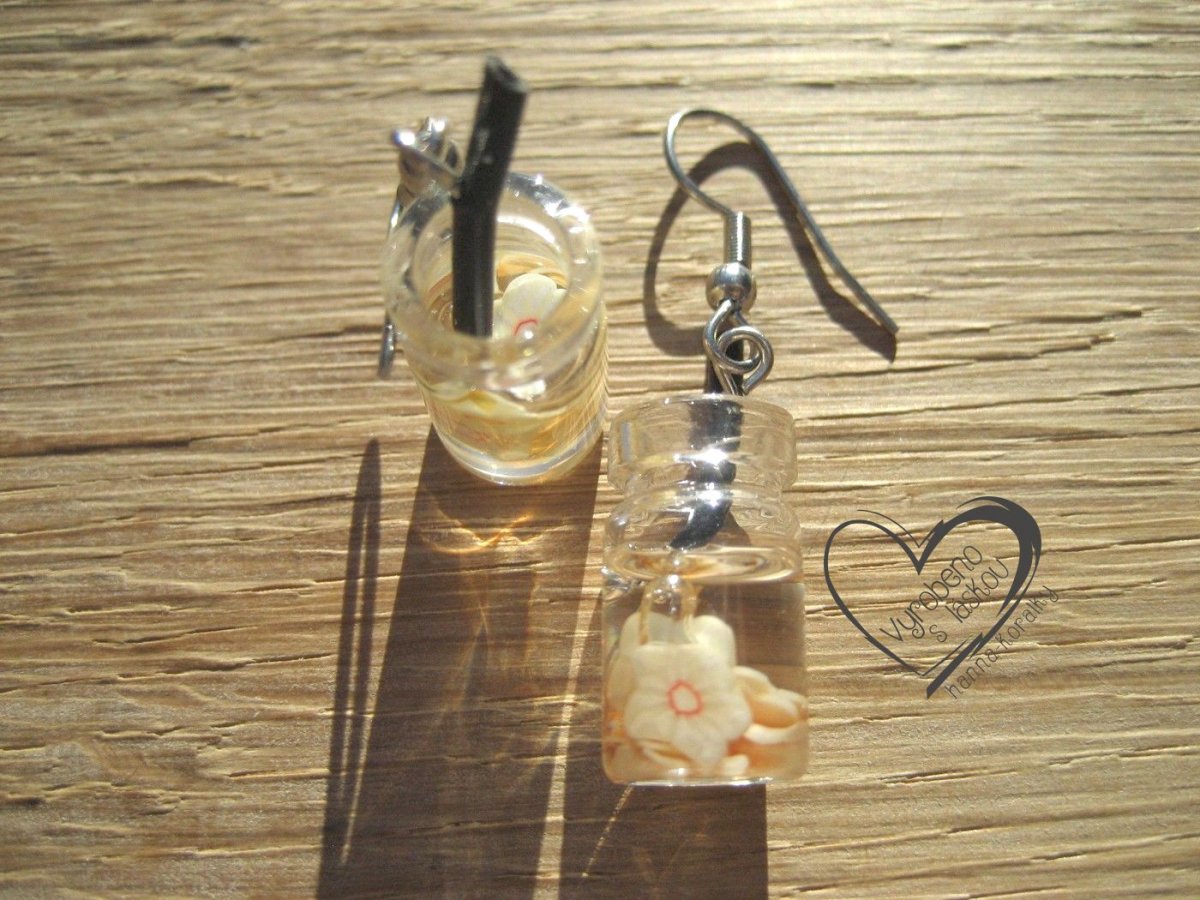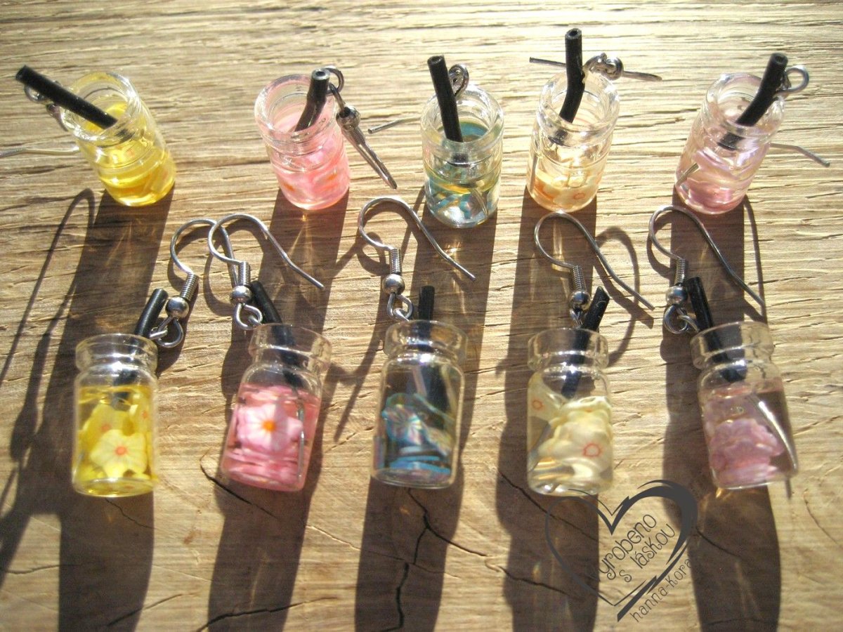 Veselé, hravé letní náušnice - skleněná sklenička s letní limčou, brčkem a květy v 5 barvách - žlutá, růžová, modrá, světle žlutá, světle růžová - délka náušnic 4,1cm včetně náuš. háčku z nerez oceli, uvedená cena je za jeden pár náušnic, do poznámky uveďte vybranou barvu