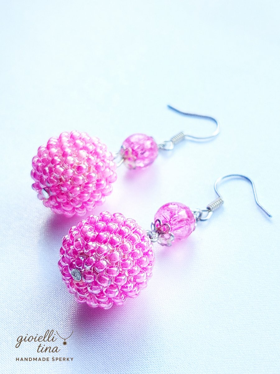 Tyto nápadné a veselé náušnice ve stříbrném provedení jsou ideálním doplňkem pro každou ženu, která miluje barvy. Jsou tvořeny dvěma korálky, kde spodní korálek je tvořený drobnými růžovými rokajlovými korálky, které jsou pečlivě uspořádané do tvaru kuličky, což vytváří krásný, strukturovaný povrch a horní korálek je průhledný, světle růžový a má jemnou, prasklinovou texturu, která mu dodává zajímavý vzhled.