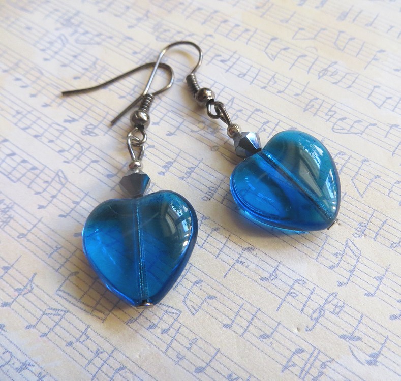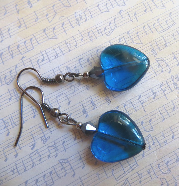 Náušnice vyrobené ze skleněných srdíček, broušených korálků sluníček a komponentů z bižuterního kovu v úpravě gun metal. Délka náušnic bez háčku je 2,3 cm.